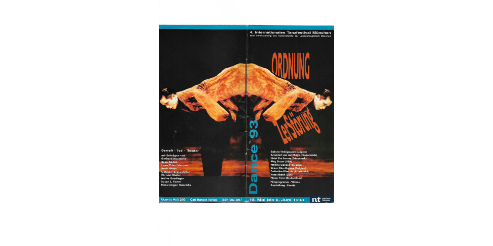 Das Motto des Festivals lautete „Ordnung und ZerStörung“. Unter diesem sehr weitgefassten Thema wurde „ein Querschnitt der jüngsten Entwicklungen im Medium Tanz, Tanztheater, Performance geboten – ein Medium, das wie kein zweites geeignet scheint, die gegenwärtigen kulturellen Erschütterungen zu reflektieren“, schreibt Siegfried Hummel, seit 1989 amtierender Kulturreferent der LH München im seinem Grußwort. Mit der provokativen Überschrift „Pornos in der Panzerhalle“ wurde in der „Abendzeitung“ (Roland Schmidt, 6./7.3.1993) das Festival-Programm angekündigt, womit bereits indirekt auf einen der Höhepunkte hingewiesen wurde. Der gebürtige Iraner Reza Abdoh (1963–1995), seit 1980 in den USA, war mit seiner in New York gegründeten Company Dar a Luz in der Panzerhalle auf dem Domagkgelände zu sehen. In seiner neuesten Arbeit „The Law of Remains“ porträtierte er den Serienmörder Jeffrey Dahmer in der Art eines zeitgenössischen Theaters der Grausamkeit, dessen Leben er mit der Pop-Ikone Andy Warhol verwob. Das Publikum erlebte die DarstellerInnen hinter einem Maschendrahtzaun in einem Szenario aus „Sex, Mordlust, Kannibalismus und ohrenbetäubendem Lärm“.