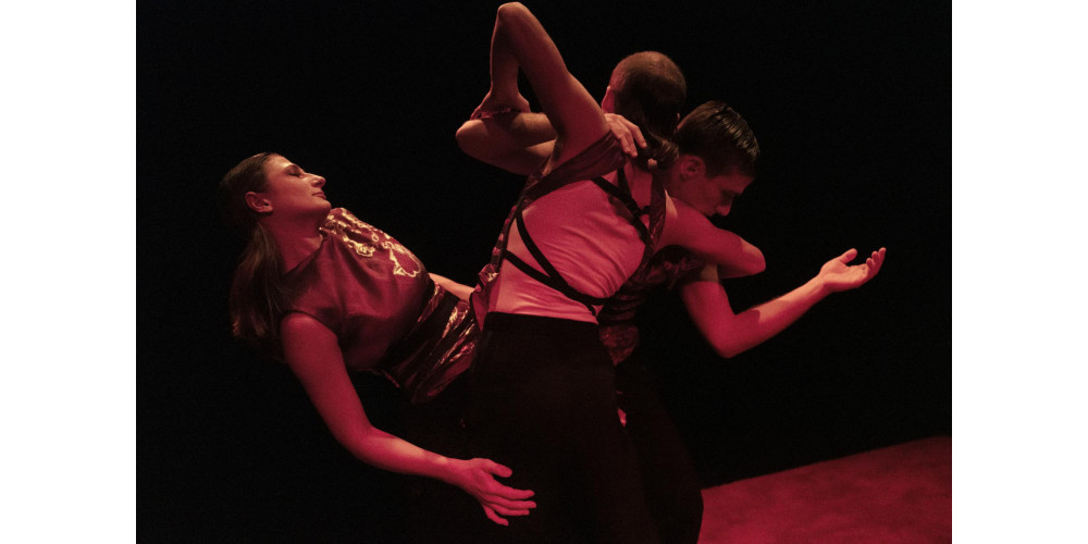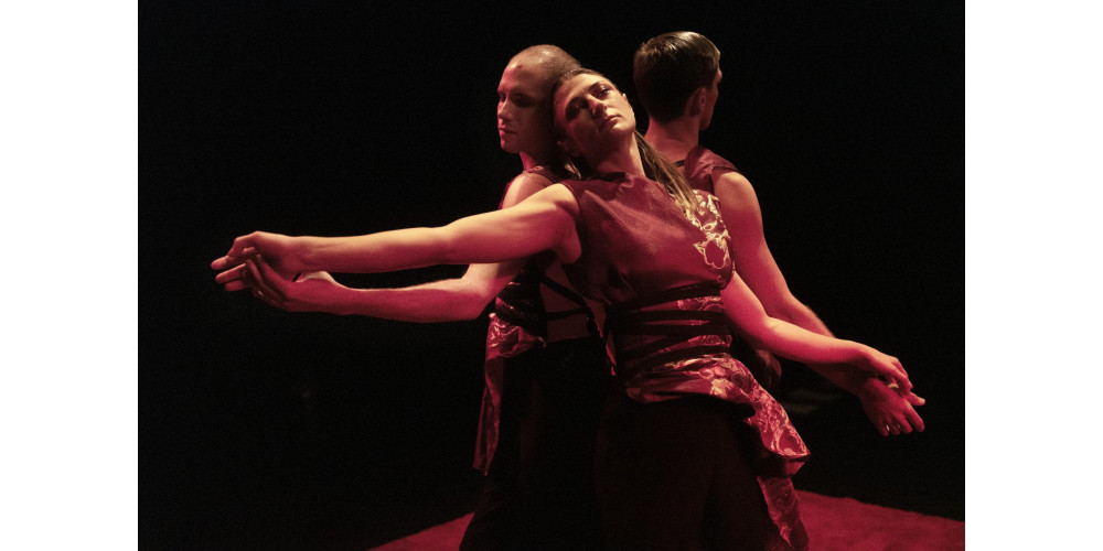 Indem der Beat immer stärker und eindringlicher wird, beginnt sich das Gewirr der drei Tanzkörper in Zeitlupe zu bewegen, weich, sinnlich, wie in Trance und im Rausch einer ausgelassenen Partynacht. Die Tänzer*innen Anima Henn, Alexandre May und Alessandro Sollima, allesamt gekleidet in weite schwarze Stoffhosen, weiße Unterhemden, anfangs darüber rote Oberteile mit orientalisch anmutenden Goldmusterungen, agieren als dreiteilige Körpereinheit. In weichen Bewegungen suchen sie die Nähe zueinander, berühren sich auf intime Weise, und es scheint, als erforschten sie die Körper der anderen und damit ihren eigenen, während mittlerweile bewegte Discolichter zur immer wiederkehrenden Liedzeile „You gotta feel it“ über die Bühnenwand tanzen. Während die Musik nach einigen Minuten ihren energetischen Höhepunkt erreicht, bleibt der Tanz beinahe schüchtern, zurückhaltend, bei sich und erzeugt eine anregende sinnliche Spannung.