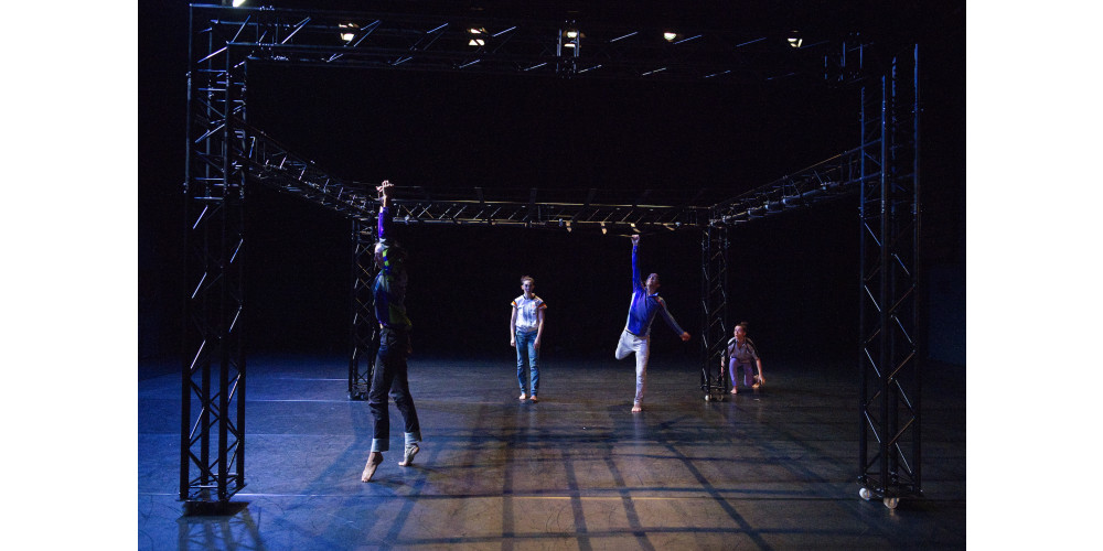 Zu zunächst zart anmutenden Klängen (Stavros Gasparatos) schält sich eine im Netz befindliche Gestalt aus der tiefschwarzen Dunkelheit des Bühnenraums heraus. Ein einzelner Körper, der mit zaghaften Slow-Motion-Bewegungen seinen horizontalen Umraum entdeckt und nach und nach von den anderen drei Tänzer*innen Gesellschaft erhält. Jede*r für sich erkundet zunächst behutsam die auf kleinem Minimalraum beschränkte Umgebung, tastet sich vor und vergrößert den Bewegungsradius – vier Individuen für sich, auf der Suche nach sich selbst, nach der eigenen Identität – integriert in ein Netz vermeintlicher Sicherheit oder doch ein Netz der Begrenzung? Erst allmählich entdecken die Performer*innen im sportiven Casual-Look – barfuß, Jeans, Streifen-Shirt – die vielfältigen Möglichkeiten, die das unter ihnen befindliche Netz auch in der Vertikale zur Bewegung bietet: Ein vorsichtiges auf den Netzgurten Balancieren wird ebenso erprobt, wie ein Legen auf die Striemen oder ein geschmeidiges durch das Netz Hindurchgleiten. Aus diesem vermeintlich ‚behaglichen‘ Zustand entwickeln sich alsbald bedrohliche Situationen, wenn zwei Tänzer*innen das ‚gemachte Nest’ verlassen und auf den Boden hindurchrutschen – die über ihren Köpfen gefährlich schwebenden Tänzer*innen drohen spinnengleich auf ihre Opfer zu stürzen – mit vollem Gewicht. Doch alle vier landen in vollendeter Kontrolle auf dem Bühnenboden, wagen den Sprung ins Freie – in die Freiheit.