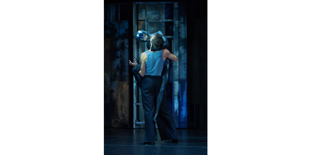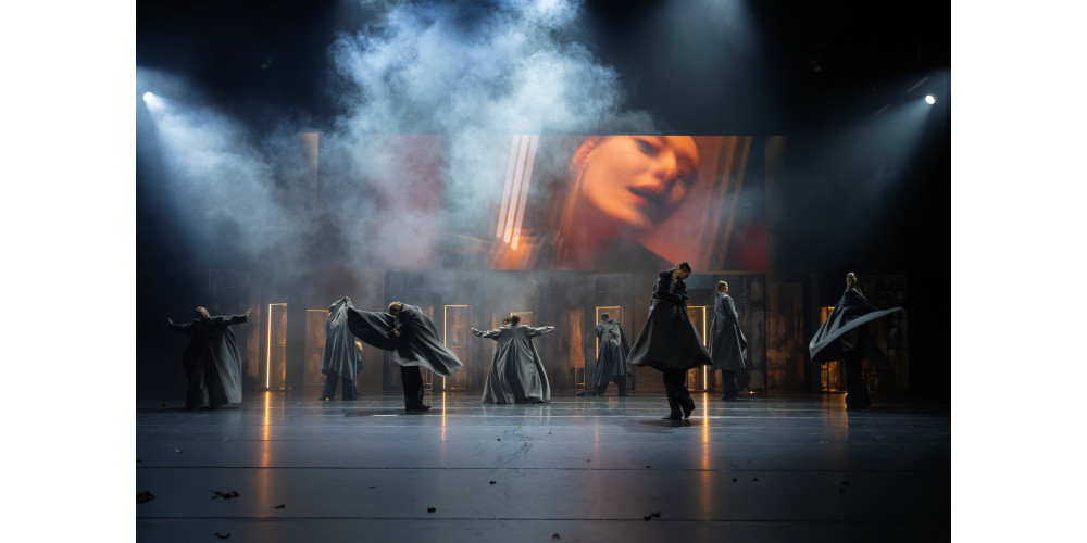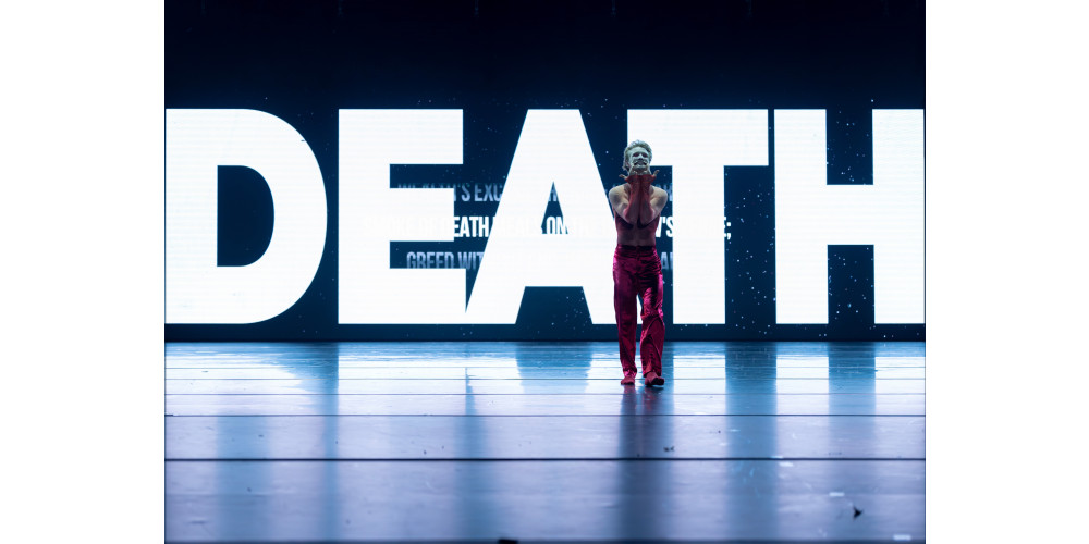 Die Omnipräsenz dieses ohrenbetäubenden Redens, Feststellens, Meinens, Findens und Forderns, dargestellt in großen verzerrten Lettern und Fotos, erzeugt ein den Herzschlag beschleunigendes, dumpfes Sägen, Hämmern und Rauschen. Und all das steht in reziproker Verbindung zu jenem Tempo und Timbre, das man seit dem vergangenen Wochenende in Goyo Monteros neuestem Wurf am Staatstheater Nürnberg erleben kann. Das Stück mit dem Titel „Steppenwolf“ nach dem gleichnamigen Roman von Herman Hesse aus dem Jahr 1927 funktioniert wie ein schnell geschnittener Videoclip, mit Anleihen bei Peeping Tom oder gar Arthur Schnitzlers „Traumnovelle“, verfilmt von Stanley Kubrick unter dem Titel „Eyes Wide Shut“. Hier übernehmen die scharf aneinander und wie im Traum aufpoppenden Bilder, erzeugt durch Tanz, Schauspiel, Sprache, Masken und Gesang oder durch riesige Projektionen von großer oder kleiner Laufschrift, in denen die Worte „kill“, „war“, „the end“ blinken, oder gar Traumbilder, das Ruder. Die Narration geht unter: Nur noch einzelne „erzählende“ Teile schwimmen am Ende wie Inseln in einem aufgepeitschten Ozean im Geist der Betrachtenden.