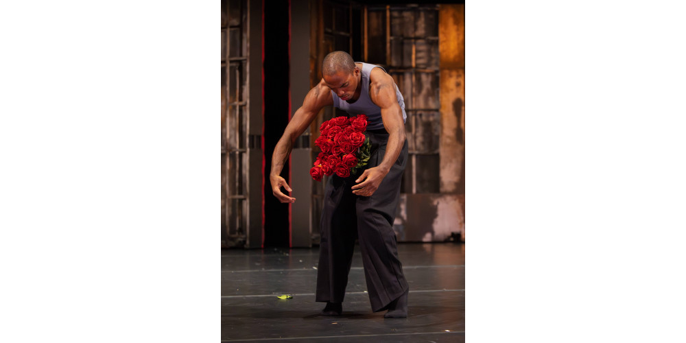 Schon im zweiten Bild ist die Choreografie der Gruppe dergestalt, dass alle Tänzerinnen und Tänzer Harry Haller sind. Ein Strauß roter Rosen symbolisiert die kurze Begegnung mit der Utopie der Liebe. Er wandert von Körper zu Körper. Die Tänzer erscheinen und verschwinden dabei in rascher Abfolge aus und in den Türen, die Wechsel lassen sich kaum vorhersehen, der Rhythmus in der Abfolge der Bewegungen ist hart, zupackend und übersichtlich. Der Verstand möchte das angebotene Bild identifizieren und rutscht doch ab. Seinen ersten Höhepunkt erlebt das Stück, als ein Tänzer mit einer Kamera in der Hand beginnt, das, was sich wie in einem Bordell hinter den Kulissen abspielt, zu filmen und auf der Bühne auf eine große Leinwand zu projizieren, während vorne das Tanzgeschehen weitergeht. Als sich die Kamera schließlich auf das Publikum richtet und sich das Parkett als Masse im Film auf der Bühne sieht, dann plötzlich weggeknipst wird zugunsten einer Aufnahme leerer Reihen, in denen plötzlich ein Mann im weißen Laboranzug wahlweise ein rotes Verbotsschild beziehungsweise ein grünes „Erlaubnis“-Schild hochhält, wird klar, dass hier nicht einer zeigen möchte, dass er „immersives Theater“ kann, sondern dass das Werk, das an diesem Abend kreiert wird, woanders liegt: beim Zuschauenden.