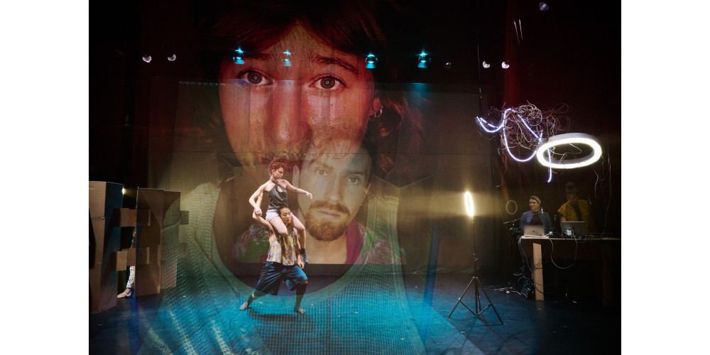 Ist das, was ich sehe, Realität – und wenn ja, wie viele? Diese Frage möchte man sich gleich zu Anfang stellen: zu Elektromusik kreist eine Tänzerin – oder ist es eine Influencerin, die content kreiert? - mit einer Kamera, vor die eine Ringleuchte montiert ist, um eine Konstruktion aus faltbaren Stellwänden. In den Falten stehen, für das Publikum nicht sichtbar, die übrigen Tänzer*innen, ihre Bilder werden über die Kamera auf die Rückwand der Bühne übertragen. An Hans van Manens LIVE erinnernd, stellt sich die Frage, wer real(er) ist: der lebende, atmende Tänzer, den das Publikum nicht sehen kann, oder seine zweidimensionale Projektion.