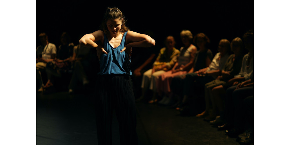 Zuvor hat das Publikum im Kreis auf Stühlen und davor ausgelegten Kissen Platz genommen. Anders als bei Felix Ruckerts „Ring“ – der 25 Jahre alten Eröffnung der diesjährigen Tanzwerkstatt Europa – blicken die Zuschauer*innen hier in den Kreis hinein statt heraus. Suchende Blicke schweifen an den Sitzenden entlang. Wo und wie wird Jovana Zelenović – eine tolle, beeindruckend feinfühlige Tänzerin – die Arena betreten? Erwartungsvolle Stille macht sich in dem von oben angenehm ausgeleuchteten Bühnenraum breit. Inmitten des Publikums spreizt sich ein nackter Fuß. Geradezu butohesk ist er nach innen verbogen. Langsam und extrem angespannt wie unter spastischen Krämpfen arbeitet sich ein Bein hoch in die Luft. Langsam gerät der Körper der 1996 in Belgrad geborenen Tänzerin in Bewegung. Das Unerklärbare bricht schleichend aus ihr heraus und verwandelt sie in ein oszillierendes Wesen: getrieben, suchend – im Spannungsfeld von zwanghaften Stereotopyen, Wut, Trauer, Verzweiflung, Schuld, Ohnmacht, Hyperaktivität und Furcht bis hin zur Isolation. Die Glieder wollen ihr nicht mehr richtig gehorchen. Ihre Arme verdrehen sich auf die unnatürlichste Weise. Jovana Zelenović wird zum Vexierbild eines schweren Traumas. Sie ist nicht mehr Herrin über sich selbst und kippt seitlich vom Stuhl, was ihre Sitznachbarin in Bedrängnis bringt. Wie geht man um mit solchen Situationen?