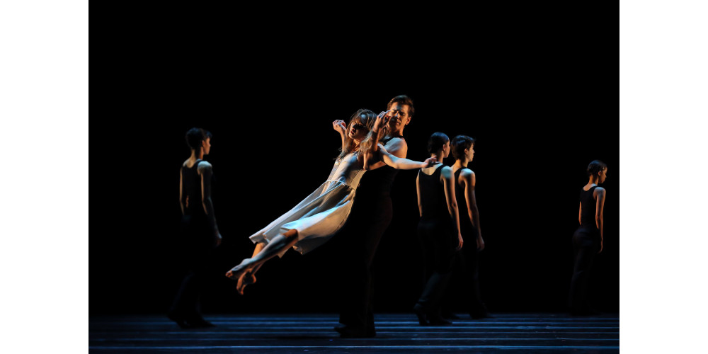 Von immenser Tiefe, Struktur und Ausdruckskraft zeugt „Return to Innocence“, das man vielleicht als Requiem bezeichnen könnte, eines erst Neunzehnjährigen, der einen geliebten Menschen verloren hat und dieses sehr persönliche Trauererlebnis verarbeitet – aus der Sicht eines Tänzers und zugleich Beobachters. Simon Adamson-de Luca, der seit 2023 Mitglied der Junior Company ist, präsentiert hier auf Einladung von Ivan Liška (aus einem Pool von immerhin 400 Bewerbern) seinen ersten Auftrag als professioneller Choreograf für die Heinz-Bosl-Stiftung. Das durchstrukturierte Werk, das sich zwischen Klage, Trauer, Melancholie und der Darstellung des Paradieses im wahrsten Sinne bewegt, stellt ein Paar in den Mittelpunkt des Geschehens, das mal symbiotisch, mal innerlich zerrissen oder sehnsuchtsvoll agiert.