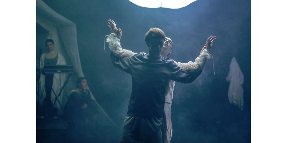 Auf dunkler Bühne unter einer Art Zeltplane im Hintergrund drängen sich anfangs bloß schemenhaft erkennbar die Protagonist*innen. Von der Decke herab hängen wolkig gebauscht durchscheinend dünne weiße Stoffplanen. Lange Kapuzenumhänge sind an der Rückwand zu erkennen und werden bereits von einzelnen Tänzer*innen getragen. Langsam zu summenden Klängen der Live-Band, die sich immer stärker in die Performance einbringt, beginnen ihre Körper zu schwingen. Unter dem Podium schwappt eine erste bodennahe Welle Trockeneis-Nebel Richtung Publikum. „We are the dreamers of our lives“ lautet Lukas Bamesreiters erste für diesen Abend geschriebene Liedzeile. Danach erobert das Tanzkollektiv individuell impulsiv allmählich die freie Fläche im Vordergrund für sich, wobei ihr Augenmerk zu Beginn allein auf das Musikertrio gerichtet ist. Das Publikum als Adressat für eine Arbeit, die laut Programmzettel „das Verständnis von Normalität und Abweichung neu definiert“, rückt erst allmählich in den Mittelpunkt der wie ein Konzert mit eingeschworener Fangemeinde inszenierten Show.
