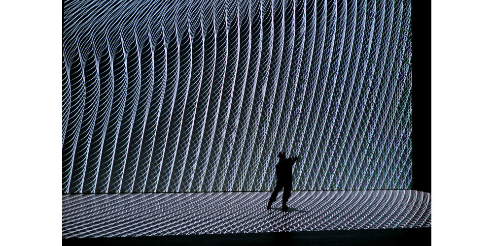 Die braucht der japanische Multimedia-Künstler Hiroaki Umeda nicht, denn bei ihm entsteht offenbar alles aus seinen eigenen Bewegungen. Das elektronische Knistern und Knattern und die aus einer einzigen horizontalen Linie geborenen Visuals. Kleine Ableger davon flitzen als weiße Tierchen oder lange Nadeln über den Screen, als Kometenregen, Funkenflug und Bestandteile einer riesigen Welle, bevor sie am Ende ordentliche Webmuster bilden. Während Umeda als Tänzer davor zuckt, stampft und den Energiefluss zu dirigieren scheint, wünscht man sich für die Bilder von „Intensional Particle“ eine räumlichere Projektionsfläche, die den menschlichen Körper ganz umgibt und nicht nur hinterleuchtet. Überhaupt werden die Wünsche nach diesem hybriden Abend vermutlich in alle möglichen Richtungen stieben. Das bringt es so mit sich, wenn verschiedene künstlerische Disziplinen, Publika und Erwartungen ganz neu gemischt werden.