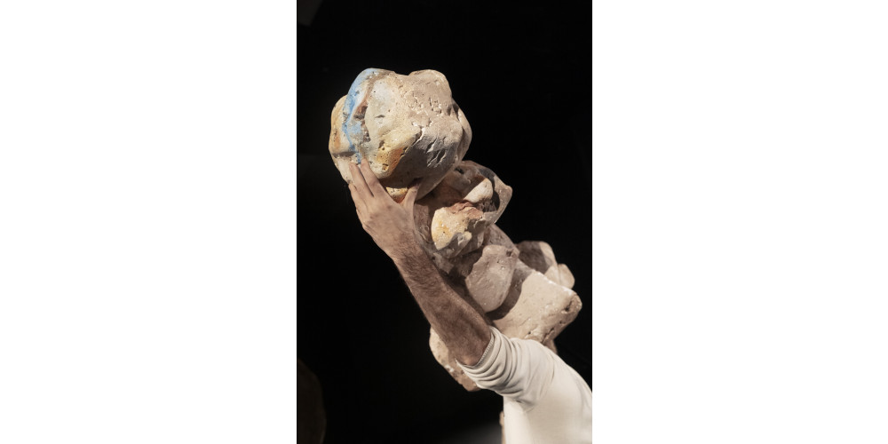 „THINGS“ aktiviert die vorurteilsfreie Neugier der Kleinsten und lenkt sie auf das, was sonst gerne übersehen oder skandalisiert wird. Die beiden Performer*innen ziehen und drehen anfangs auch die Steine mit Hilfe der Seile über die Bühne. Später tragen sie sie in Lichtkreise auf dem Boden, nur eine Kinderarmlänge von den Zuschauer*innen entfernt. Ein vorheriger kurzer Blickkontakt fragt sie um Erlaubnis. Und dann Spot auf das Ding, das bei genauerer Betrachtung Einschlüsse und Rauheiten aufweist – manche von ihnen sogar bunte Adern und Moosbewuchs – und also eine Geschichte hat, auch wenn es in diesem Fall nur ein Theaterutensil aus Pappmaché ist. Salome schmiert einen schimmernden Batzen Slime auf die derart exponierten Steine. Ein Oberflächen-Clash und eine Minimal-Bewegung, denn die glatte, schleimige Substanz kriecht in die Ritzen und langsam auch am Stein herab. Alfredo tanzt wie ein Partner der Steine mit ihnen über den Boden oder schultert sie wie Atlas, der Weltenträger. Und die Materialperformance wird tänzerischer, als er langsam durch den Raum zirkelt und die Steine dabei wie Zweit- und Dritt-Köpfe vor die eigene Stirn hält oder bis zu fünf von ihnen auf Schultern und Armen balanciert. Die Behauptung, dass sie schwer sind, spielt er mit. Dabei hat man sie zuvor schon als leicht erlebt. Noch so ein Widerspruch.