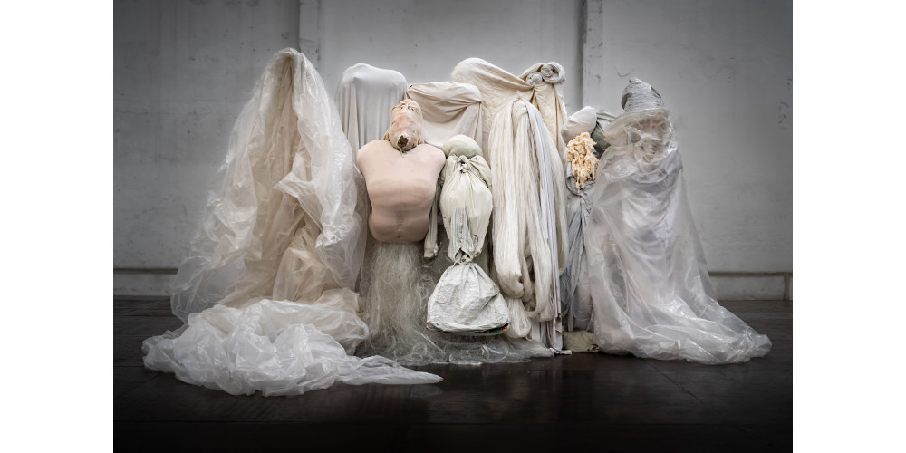 Für eine Müllhalde ist die Mischung aus Stoff und Folie, die in Lia Rodrigues´ neuem Stück „Borda“ die Bühne bedeckt, jedenfalls viel zu hell und clean. Dennoch haftet denen, die hier zu hausen scheinen, die Aura von Outcasts an. Und als sie einmal urplötzlich ihre Gesichter zeigen, ist das so schnell wieder vorbei als wäre es nur eine Fata Morgana gewesen. Erst als die sich sehr allmählich beschleunigenden Bewegungen der neun Performer*innen in Interaktion mit dem textilen Bühnenbild rascheln, knistern und Wellen erzeugen, schieben sich Assoziationen mit Wasser in den Vordergrund, wie man sie etwa aus dem Stück „Pindorama“ kennt, mit dem die brasilianische Choreografin bereits vor zehn Jahren in München gastierte. In „Borda“ türmen sich auch mal Folienwogen über den Köpfen und eine Kinderstoffpuppe fliegt durch die Luft. Ein kleiner Gruß an die europäischen Außengrenzen?