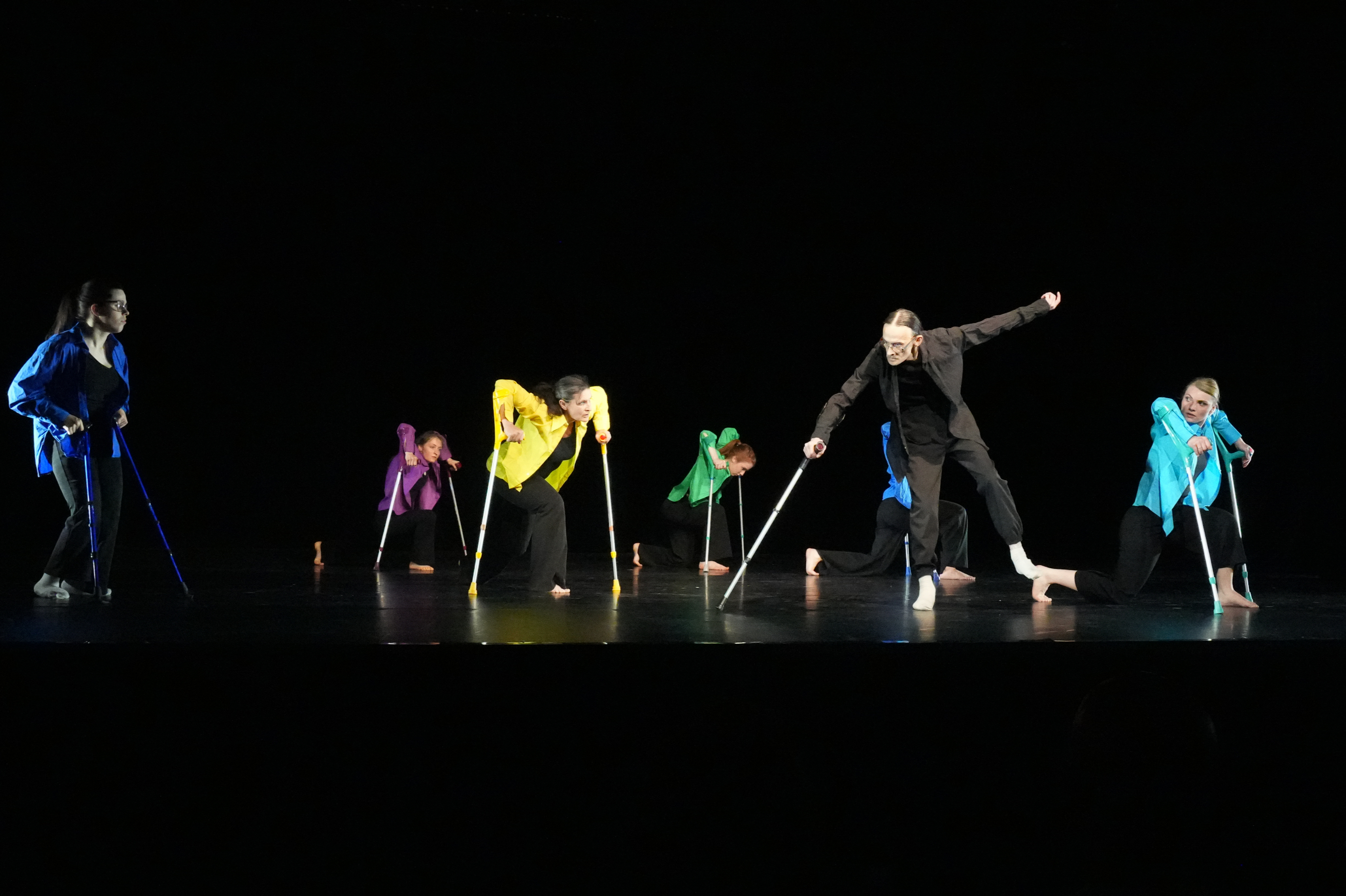 Als billiger Spott könnte das „Krückenstück“ leicht (miss-)verstanden werden, wenn gelenkige junge Frauen in quietschbunten Jacken mit eben diesen Hilfsmitteln herumalbern, einknicken, stolpern und stelzen, als machten sie sich über Menschen mit Behinderungen lustig. Zusammen mit den gehbehinderten Tanzenden wird daraus ein faszinierendes kleines Lehrstückchen über Krücken als Waffe, Spiel- oder Werkzeug und natürlich – Stütze. Durchaus auch im übertragenen Sinn, greifen wir doch oft genug auch geistig und emotional auf Krücken zurück. Den Ausklang bildet eine köstliche Parodie auf die Konsumgesellschaft mit ihren glanzvollen Versprechungen.