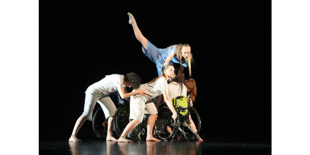 In starken Bildern beleuchtet es offen und überzeugend die Defizite, die beim Umgang zwischen Menschen mit und ohne Behinderung häufig noch vorherrschen. Mit sichtbarem Schmunzeln wird der Anspruch verdeutlicht, der seitens des Teils der Gesellschaft ohne Behinderung im Umgang mit Personen mit Behinderung an den Tag gelegt wird. Dabei geht es um Nichtbeachtung, Ausgrenzung, ebenso wie um Annäherung und Zurückweisung. Nicht nur die Perspektiven, auch die Rollen werden in „The Other Side“ gewechselt, wenn sich Performer*innen ohne Behinderung plötzlich im Rollstuhl wiederfinden und Rollifahrende aufrechtstehend mit den anderen zusammen tanzen. Einerseits bewundert man die Hartnäckigkeit und Kraft, die es kosten muss, sich aus der Komfortzone des Gefährts herausreißen und kopfüber wieder hineinfallen zu lassen. Andererseits wird man als Zusehende*r mit der Frage konfrontiert, inwieweit man sich selbst auf andere verlassen würde und möchte.