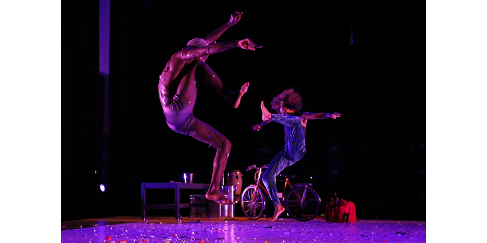 „Zona Franca,“ der Titel des Abends, heißt so viel wie „Freihandelszone“ und weist auf die Unerschrockenheit hin, mit der hier kopiert und kombiniert wird, was gefällt. Aber er meint auch die wiedergewonnene Freiheit nach der rechtsnationalen und menschenverachtenden Ära Bolsonaro und schreit uns gut gelaunt entgegen: „Es gibt ein Morgen!“. Und was für eines. Man darf halt bloß nicht in Selbstmitleid erstarren. Im Kölner Karneval gibt es den gerne auch von politischen Gruppierungen gekaperten Spruch „Arsch huh – Zäng ussenander“. Und den scheint die Truppe aus Rio zu leben. Unrecht erdulden und Klappe halten gilt nicht. Rassistische und sexistische Zuschreibungen? Machen sie zur mit Humor geschärften Waffe. Wenn frau in der besonders arschfixierten brasilianischen Gesellschaft sowieso auf den Allerwertesten gestarrt wird, zwinkert der den Starrenden munter zu: Eine der Tänzerinnen sitzt im Spagat auf einer hohen Bank, die rampennah vorbeigerollt wird, und lässt ihre Pobacken zur Musik hüpfen und ja: singen. Und auch alle anderen haben individuelle Superkräfte. Ein Tänzer winkt im Kopfstand auf eine Art mit den Beinen, dass sie wie überlange Arme an einem kopflosen Torso aussehen, ein anderer bläst den Bauch zum 9. Schwangerschaftsmonat auf und rafft ihn anschließend zu einem beleidigten Gesicht zusammen. Auf dem Bauch, dem Po oder in der Hocke über die Bühne hoppeln: Alles kein Problem! Und die größte Person auf der Bühne kann sich die Kleineren umstandslos unter die Arme klemmen oder über die Schulter hängen. Einiges davon mag unsere Maßstäbe der Political Correctness irritieren, aber wer sonst hätte das Recht, auf sie zu pfeifen, wenn nicht dieses diverse, queere und glänzende Ensemble?