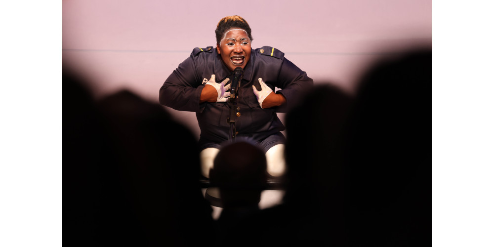 Es ist nicht direkt eins der schönsten Wörter: „Irre“ klingt schon mal geringschätzend. Ist aber viel öfter bewundernd gemeint. Und treffend. Anders als „irre“ kann man Marlene Monteiro Freitas‘ „ÔSS“ kaum nennen. Was sie gemeinsam mit den portugiesischen Performer*innen von Dançando com a Diferença in den Kammerspielen auf die Bühne gehauen hat, scheint komplett frei von Sinn zu sein. Zumindest für das Publikum. Neun Beteiligte verkörpern Unmengen „verrückter“ Charaktere, die einfach vor sich hin existieren. Weiße Kapitänsuniformen könnten ein Kreuzfahrtschiff andeuten. Weiße Kittel könnten auf ein Krankenhaus hinweisen. Schließlich findet irgendwann unter lautstarken Qualen eine Geburt statt. Was aber macht eine Torera auf einem Kreuzfahrtschiff? Oder in einem Krankenhaus? Und warum wird das lautstark mit einer Opernarie unterlegt?