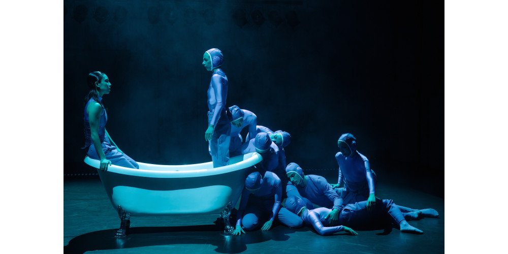 Zu Beginn schickt Alfonso López González die Tänzerin Kako Kijima zu einem psychischen Ego-Horror-Trip ins Badezimmer. Schon deren Blick in den Spiegel über dem Waschbecken im Hintergrund verrät Niedergeschlagenheit gekoppelt mit innerem Aufruhr. Ihr Versuch, Ruhe zu finden, gleicht einer Schlingerfahrt durch Stürme und Flauten. Getuschel und Geflüster erfüllt den Raum. Das Dröhnen im eigenen Kopf inszeniert González tänzerisch vortrefflich. Als die Tänzerin zum Sound einer launigen Jazztrompete in die auf dem rot beleuchteten Tanzboden stehende Wanne steigen will, formieren sich sogleich ganz in blaue Trikots mit Badehauben gekleidete Wesen schier wasserstrahlartig zu einem gallertartigen Mehrfach-Gegenüber. Dieses schwappt bald mit in die Wanne und kippt diese später mitsamt der darin Badenden um. Die Interpretin, von der Gruppe umspült, wird mal zärtlich gerahmt oder mit krallenden Händen stumm angebrüllt, was das Chaos guter und schlechter Gedanken in Kopf sehr anschaulich in all seinen schnell wechselnden Schattierungen widerspiegelt.