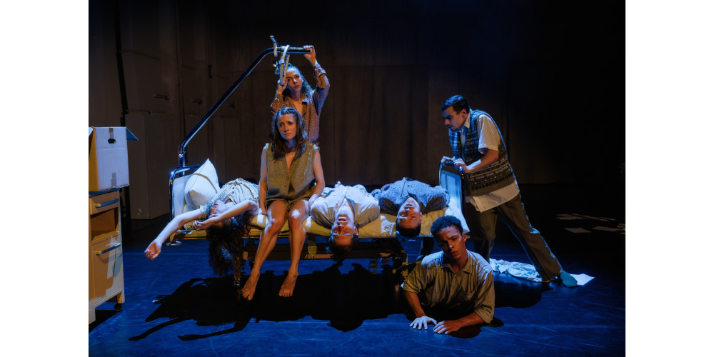 Da gibt es Augenblicke vollkommener, fast apathischer Stille. Dann fährt zu Akkordeon- und Trompetenklängen, die an Filme von Emir Kusturica denken lassen, ruckartig Bewegung in die Glieder der Tänzer*innen. Familienmitglieder rotten sich um einen Tisch, Klamotten fliegen durch die Luft. Lucie Horná streift sich gleich mehrere Kleidungsstücke über, die man ihr kurz darauf wieder grob vom Leib reißt. Nackt bis auf den Slip wird sie auf den (jetzt) Beamtenschreibtisch geworfen. Über ihr – quasi als lebloses Anschauungsobjekt – rattert Fátima López Garcia Paragrafen herunter und eine Dokumentenliste zur Versicherungsabwicklung.