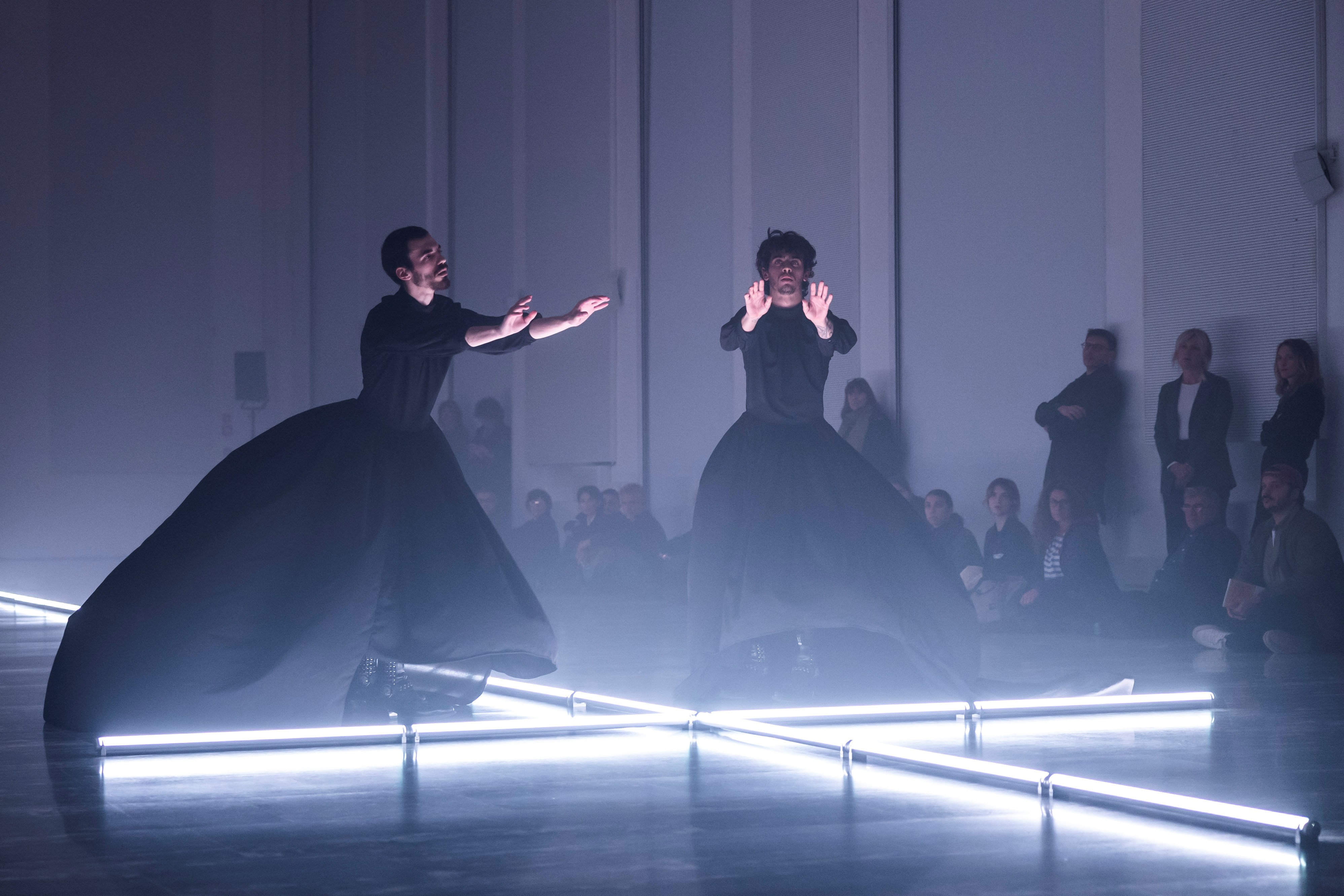 Der Raum wirkt kühl, geometrisch und leer. Drei Leichen liegen parallel zueinander, doch langsam regt sich eine. Zunächst sind die Bewegungen der Tänzerin Marina Rodríguez schwerfällig, zuckend, fast puppenhaft: ein Körper zwischen Leben und Tod. Die Reduktion der Bewegungen verleiht jeder auch noch so kleinen Geste Gewicht. Fast geisterhaft nähren sich Ignacio Fizona Camargo, Fabio Calvisi und Valentin Goniot. Liebevoll tragen sie die zwei Leichenpuppen durch den Saal. Drei apokalyptische Mönche bewegen sich ruckartig im Takt der Glockenschläge. Durch Körperkontakt werden die Zuschauer in das Geschehen mit einbezogen, sie verlassen ihre Rolle als Publikum und werden Teil eines größeren Ganzen. Das Ensemble arbeitet mit beeindruckender Präzision und mitreißender Gefühlsstärke. Sie berühren, erschrecken und hypnotisieren zugleich. Mitten in diesen abstrakten Bewegungen, in diesem Kampf gegen einen unsichtbaren Widerstand, blitzen Momente auf, in denen das Leben zurückkehrt, in denen Bewegung zu Kommunikation wird. Die Tänzer Ignacio Fizona Camargo und Fabio Calvisi spiegeln ihre Bewegungen auf gegenüberliegenden Seiten eines aus LED-Stangen komponierten Kreuzes. Deformierte, entfremdete Körper erzeugen Unbehagen, ohne je ihre Würde zu verlieren. Es sind fragile, zutiefst menschliche Wesen, die sich im Raum bewegen und miteinander in Kontakt treten. Der Saal wird Schauplatz eines gemeinsamen Sterbens, eines apokalyptischen Tanzes.