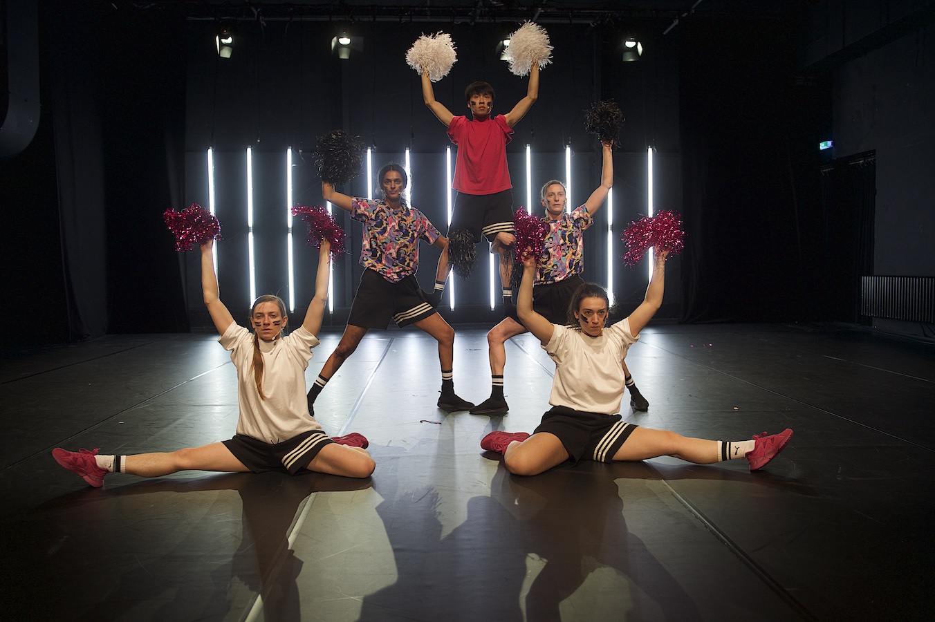 Vier Tänzerinnen und ein Tänzer in Sportkleidung. In den Händen halten sie zeitweise bunte Pompons. Sind wir beim Ballett oder doch eher beim Cheerleading? Zweifel sind angebracht. Denn skandieren die echten Cheerleaderinnen wirklich Slogans wie „Don’t give up the fights, fights“? Recken noch dazu die Arme kämpferisch in die Höhe, die Hände zu Fäusten geballt? „Silence is violence“ shouten die fünf auch einmal. Soll heißen: Die Truppe lässt sich den Mund nicht verbieten. Also doch politischer Widerstand anstatt Anfeuerung für einen Sportverein?