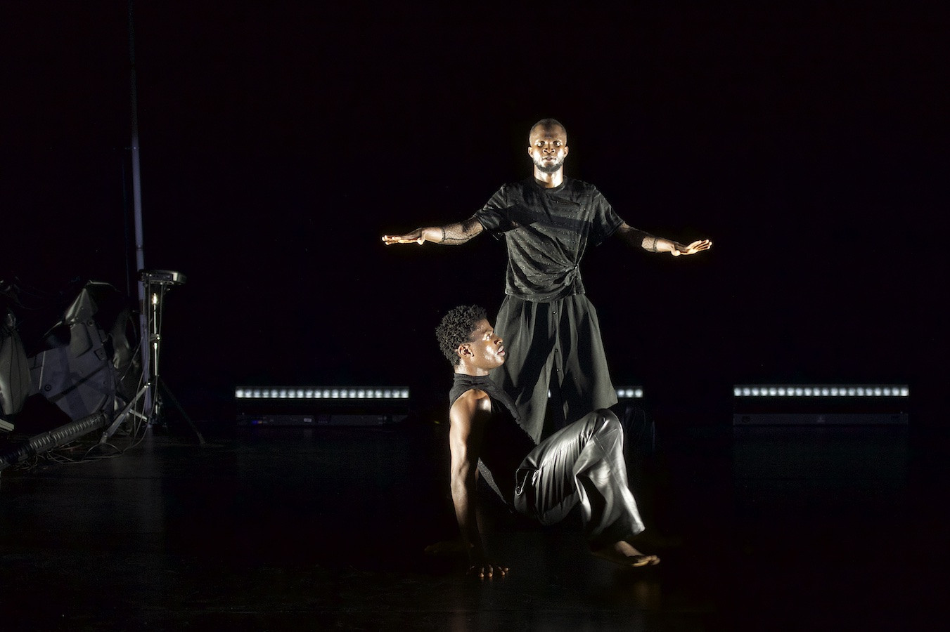 Aus der Dunkelheit schälen sich Michael Kaddu und Oluwafemi Israel Adebajo heraus. Zu Trip-Hop-ähnlichen Klängen beginnen sich die schwarzgekleideten Tänzer zu bewegen. Kaddu geht in die Hocke, lässt seinen Kopf vor- und zurückschnellen, während Adebajo rhythmisch auf den Boden stampft. Hinter ihnen eine große 3D-Projektion: Ein Tänzer, der in einer Landschaft steht, die an Caspar David Friedrichs „Eismeer“-Gemälde erinnert, und mit Schneeschichten regelrecht zugewuchert ist. Wenn er sich bewegt, meint man ein Maschinenwesen zu sehen, das aus der Filmserie „Transformers“ stammen könnte. Nur eben aus Eis und Schnee statt aus Metall.