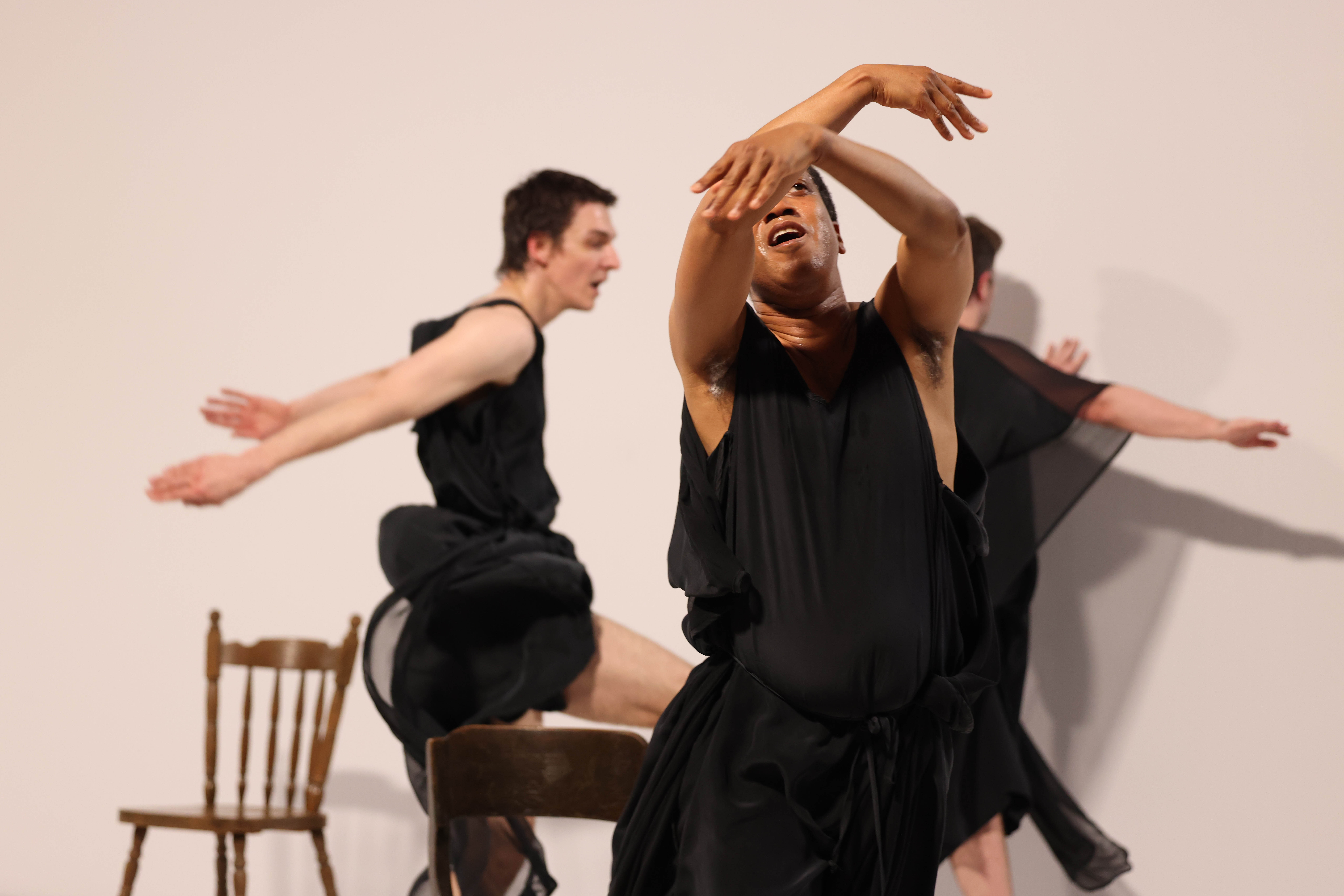 Zu „Another World“ (Anthony and the Johnsons) erheben sie sich, die Arme langsam wie im Gebet. Tränen kullern über Harrells Gesicht. Die Stimmung sinkt noch tiefer als sich die Performer niederlassen. „Don’t stop“ und „Mamma Said“ wechseln sich ab, während Harrell in schwingenden Bewegungen tanzt, sich immer wieder hinsetzt und voller Schmerz an die Stuhllehne lehnt. Auch Vidlar beginnt zu schwanken, während Lac wie festgefroren immer wieder das Mantra wiederholt, als müsste er es sich selbst einreden, um nicht zu zerbrechen. Gesang, Schauspiel und Tanz verschwimmen in einem intensiven Zwischenspiel.