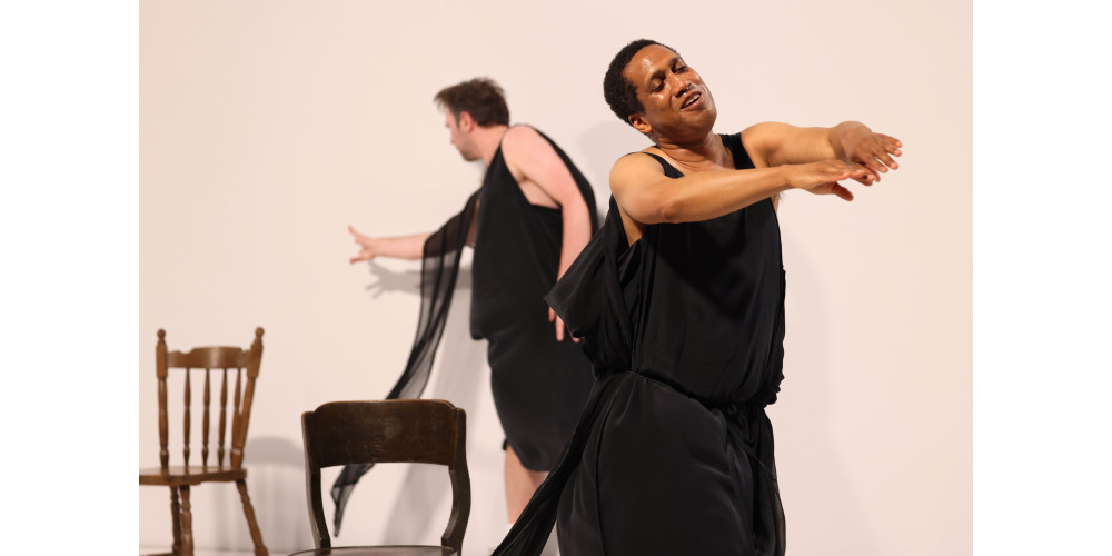 Das Publikum wird über eine Rampe in den Kunstbau vom Lenbachhaus in einen minimalistischen Bühnenraum gelockt: drei Stühle mit Mikrofonen, ein Ventilator, ein komplett weißer Hintergrund. Thibault Lac läuft nervös auf und ab, beobachtet das Publikum. Drei schwarze Kostüme hängen an einer Kleiderstange und wehen im Ventilator-Wind. Lac begrüßt das Publikum, erzählt, worum es in der Performance geht und was der Titel bedeutet. „M2M“ ist nur ein Teil einer langjährigen Serie namens „Twenty Looks or Paris is Burning at the Judson Church“, die in acht verschiedenen „Größen“ existiert. Eine davon war bereits 2015 auf dem DANCE-Festival zu sehen: „Antigone Sr. / Twenty Looks or Paris Is Burning at The Judson Church (L)“. In allen anderen Inszenierungen lautet die Frage jedoch umgekehrt: Was wäre gewesen, wenn Tänzer*innen aus der bunten Tanz- und Modeszene von queeren Schwarzen in Harlem zur Judson Church gekommen wären – einem Zentrum für avantgardistische Tanzkunst?