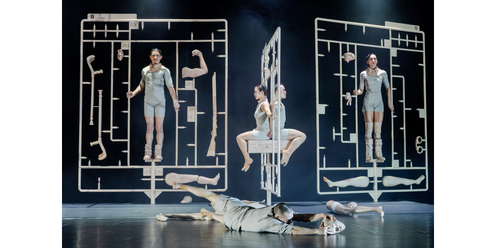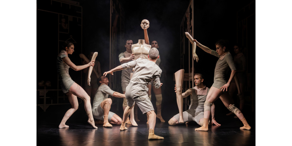 Einen großartigen Ausdruck findet dieses Leben einhauchen im Bühnenbild, in das vier wie Drehkreuze drehbare Rahmen, in die Gegenstände und Gliedmaßen zum Herausbrechen und anfänglich auch die Tänzer*innen eingebaut sind. Diese geradezu gruselige Anordnung unterstreicht die Künstlichkeit und oberflächliche Glätte jeglicher Puppe. Und sie verweist zugleich auf den in unserer Zeit überhandnehmenden Drang zum Perfektionismus und zur Selbstoptimierung, der letztlich nur auf Aldous Huxleys beklemmende Utopie der „Schöne(n) neue(n) Welt“ hinauslaufen würde. Im „Dollhouse“ hantieren die Tanzenden am Ende mit den Körperteilen einer echten Schaufensterpuppe, die mühsam zusammengesetzt, letztlich doch auseinanderfliegt. Wodrich, von der Puppe zum Mensch verwandelt, hat die Schnauze voll – und haut einfach ab, während ihm die Off-Stimme konsterniert hinterher kräht.