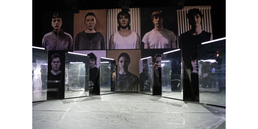 Katja Wachters Adaption von „KI essen seele auf (ORPHEAI)“, in der mit den Studierenden produzierte Videoprojektionen das live gespielte Geschehen gut ergänzen, kommt motorisch erwartbar humorvoll und bisweilen fast musicaltauglich daher. Andererseits bleibt einem immer wieder das Lachen im Hals stecken, wenn die zehn Interpreten Situationen aus dem Alltag in choreografische Tableaus transferieren, die uns letztlich allen den im Bühnensetting als mehrteiliges, mobiles Requisit verschiedentlich eingesetzten Spiegel vorhalten.