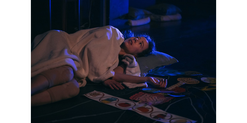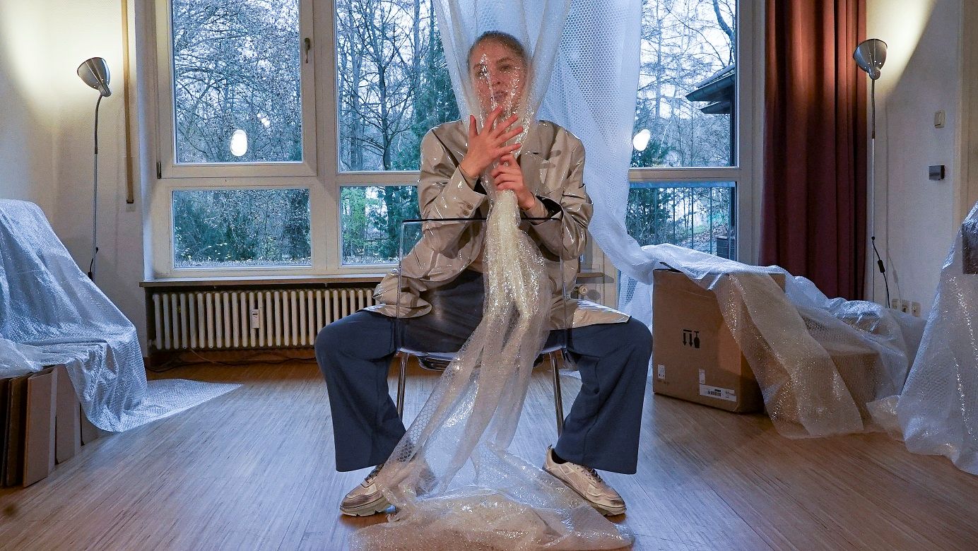 Dazwischen hat sich Hornung aber auch als echte Expertin ihrer Krankheit erwiesen, systematisch bunte Papiersymbole für alle Organe in einen Körperumriss am Boden gelegt und dabei erklärt, wie Immunüberreaktionen, Darmfehlbesiedlungen und Brainfog entstehen. Einmal stopft sie sich so lange Nahrungsergänzungsmittel in den Mund, bis man deren Namen nicht mehr versteht. Querzetin, Lysin, Taurin, D-Ribose, Nikotinsäureamid… Es folgen noch viele weitere, bis sie alles zusammen mit einem großen Glas Wasser hinunterspült.