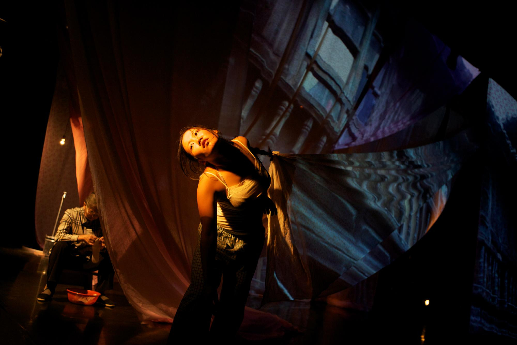 Alles ist – scheinbar – sehr schlicht. Auf der linken Bühnenseite produziert eine Frau Schuhsohlen an einer alten Nähmaschine – ein knappes Bild für das Millionenheer von Fabrikarbeitern. Im Zentrum steht ein Gaze-Zelt. Auf dessen Vorderfront laufen Sequenzen aus Wu Wenguangs Dokumentarfilm „Meine Zeit bei der Roten Garde“: gellend die anpeitschenden Parteibonzen; schrill die parteipolitisch benutzte und verhunzte Peking-Oper; wie hypnotisiert die dem Polit-Gott Mao hörigen Volksmassen. Im Wechsel dazu spricht Wu Wenguang ganz leise auf Chinesisch Erinnerungen von Zeitzeugen, während die deutsche Übersetzung auf der Gazefront zu lesen ist. Erschütternd diese privaten Aussagen von jungen Menschen, von Kindern, für die es das Glück schlechthin bedeutet, den großen Mao einmal im Leben zu sehen. So einfach lässt sich der ideologische Wahn darstellen. Und so leicht nachvollziehbar ist er durch die deutsche Nazi-Vergangenheit. In den projektionsfreien Momenten sieht man Wen Hui im Zelt-Innern, meist nur leicht nach hinten gebeugt. Wie schwebend gehalten von einer meditativen Musik (feinnervig von Wen Bin), wird sie in ihrem konzentrierten Verharren zum Mahnmal gegen die Volksverführung, gegen jede polit-religiöse Verblendung und Unterwerfung. Einmal tritt Wu Wenguang zu ihr, greift ihren Zopf, legt ihn wie eine Todesschlinge um ihren Hals. Und von hinten langsam ihre Arme wie Flügel führend, scheint er sie in die andere Welt zu geleiten. Solch poetisch eindringliche Bilder verraten Wen Huis Lehrzeit bei Pina Bausch. Und natürlich auch, dass hier zwei Künstler mit ihrer prekären „Erinnerungs“-Thematik seit zwanzig Jahren intensiv-engagiert zusammen arbeiten.