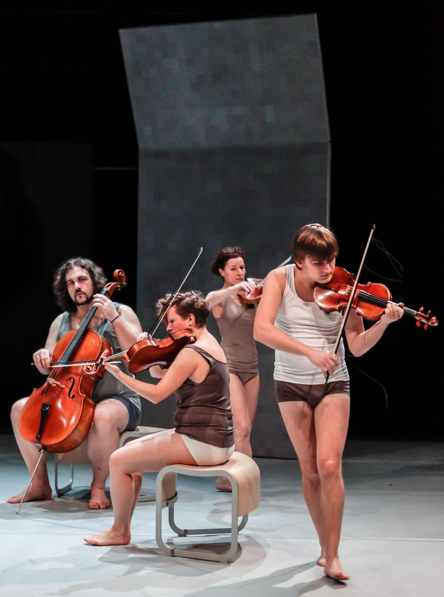 Da stehen sie, in schwarzen Zwirn gekleidet, bereit für ihr Konzert. Vier Musiker, hinter ihnen ein Halbkreis aus Hockern, auf denen ihre Instrumente liegen. Doch „If/Then For Strings“ ist kein gewöhnlicher Abend des Asasello String Quartetts. Der erste Knopf öffnet sich, die Hose rutscht zu Boden, das Jackett wird sorgfältig zusammen gefaltet. In sportlicher Unterwäsche werfen sich die Streicher in eine Tanzperformance mit Instrumenten.