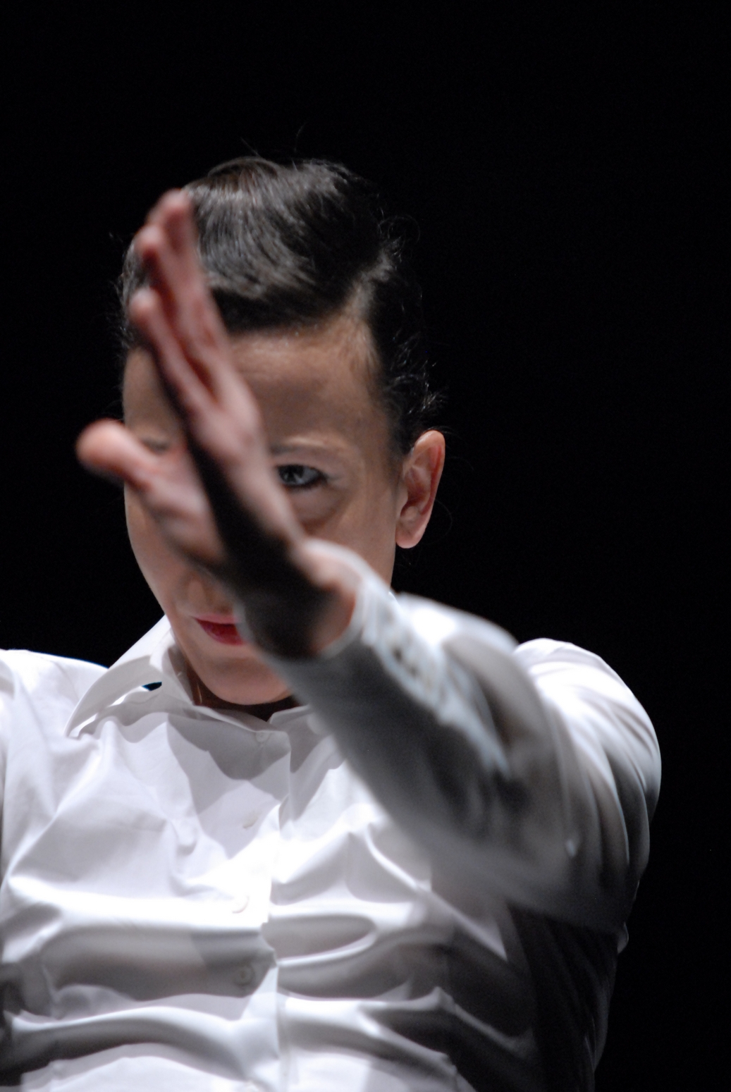 Der Spot geht an und gibt den Blick frei auf ein androgynes Wesen mit streng zurück gegelten Haaren, weißer Bluse und grauer Stoffhose. Die Tanzfläche ist auf ein Rechteck begrenzt. Untermalt von sanften Klaviertönen lassen sich langsam minimale Bewegeungen wahrnehmen. Ein Wippen, eine kurze Bewegung des Armes, ein Streicheln. Dazu nachdrückliche, bannende Blicke ins Publikum. Dieser beeindruckende Körper ist Lisbeth Gruwez, die in Zusammenarbeit mit dem belgischen Musiker Maarten van Cauwenberghe in „It’s going to get worse and worse and worse, my friend“ die Macht der Worte und Manipulation austestet. Sie wird im Laufe der 50-minütigen Performance eine Predigt halten, die nicht nur sie zum Schwitzen bringt.