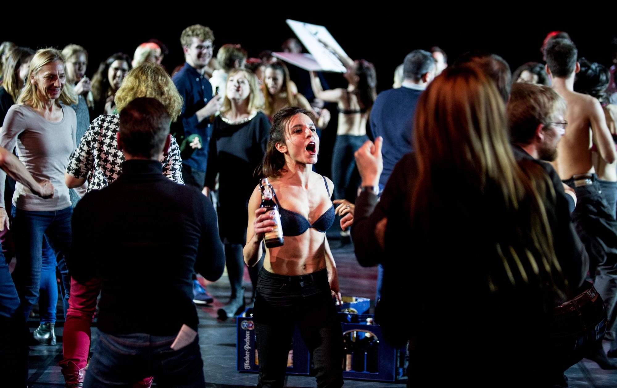 Die Tänzer sind prächtig drauf und in diversen Paarkonstellationen ineinander vernarrt. Ihre Tollheiten erinnern an eine Spielwiese von Faunen und Nymphen. Für Momente irrer Selbstverliebtheit setzt Celis tragbare Spiegelfolienwandteile ein. Mit einem Anflug von Laufsteg-Allüre kommt es zum krassen Wendepunkt. Let’s Party ist das finale Motto – und Abtanzen können die Mitglieder des Gärtnerplatztheaters bestens. Nur gucken? Gibt’s bei dieser Soap-Episode nicht! Am Ende veitstanzen Profis und Publikum gemeinsam um Kästen von Freibier herum.