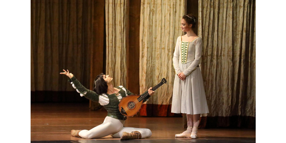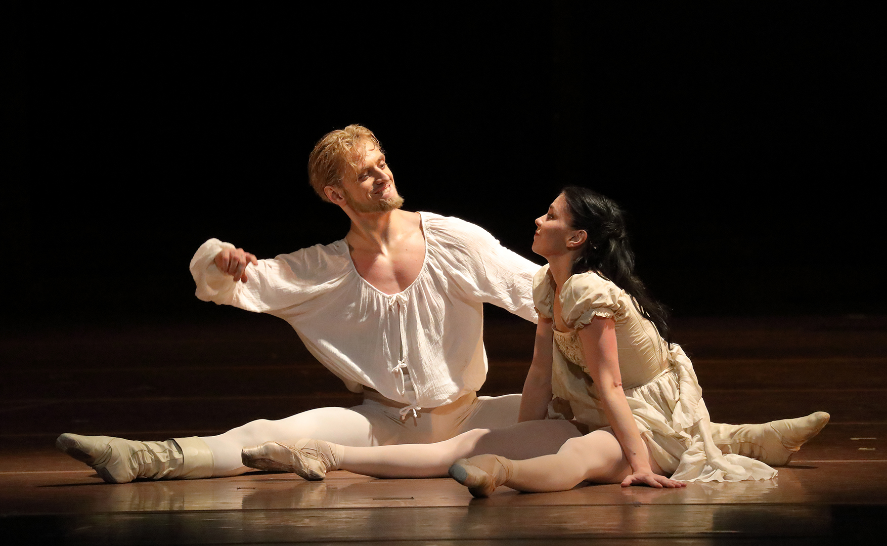 Am Mittwoch folgte „Onegin“ mit einem erneuten Gastspiel von Vladimir Shklyarov in der Titelrolle. Im ersten Bild tanzte Laurretta Summerscales vor ihren anmutigen Freundinnen von der Musik schön getragen. Jonah Cook fand als Lenski sofort gut in die Szene, zeigte durch die tänzerischen Anforderungen hindurch Lenskis Gefühle für Olga. Im Pas de deux beider entfaltete sich der Zauber der Einheit von technischer Makellosigkeit und Emotion, wie es besser wohl kaum geht. Ivy Amista spielte als Tatjana ein sehr junges, introvertiertes Mädchen, das staunt, was bei der Begegnung mit Onegin mit ihr passiert. Vladimir Shklyarovs schöne Linie, seine hohen, schnell gedrehten Sprünge und seine merkwürdige Geistesabwesenheit machten glaubhaft, wie sehr er sie beeindruckte. Als spielfreudige Dorfjugend trug das Corps mit einem kraftvollen Charaktertanz der Jungen und einem anmutig-munteren Reigen der Mädchen zu einem erfreulichen Auftakt bei. In Tatjanas Traum verzehrte sich Shklyarovs Onegin nicht in der gleichen Sehnsucht nach ihr, mit der sie ihn ersehnt, sondern blieb ein spröder Charakter. Doch er bemühte sich energisch um sie und ließ Ivy Amista den Traum Tatjanas gut entfalten. Dabei tanzte er vorzüglich und gewann auch als Darsteller intensive Präsenz.