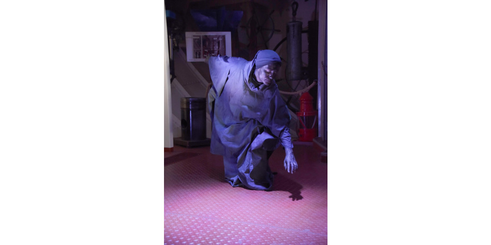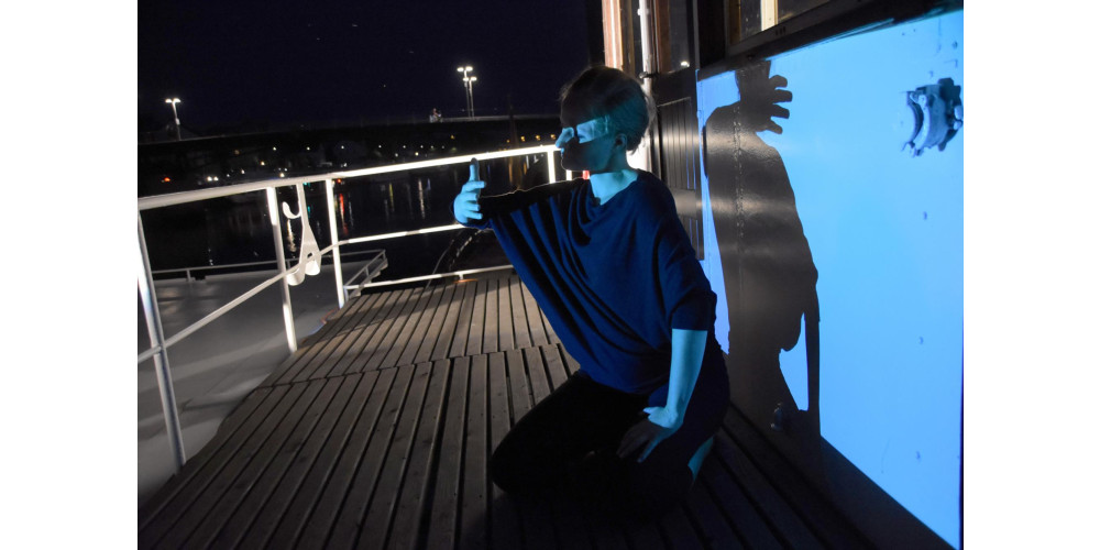 Die Ambivalenz kippt im Heck, das man durch schmale Gänge und Engstellen erreicht – zunächst – in Distanz und Abwehr. Von einer kohlrabenschwarz geschminkten Tänzerin (Marina Manganotti) geht ein faszinierendes Gefühl von Angstlust aus. Mit schwarzem Kopftuch, einem kaftanartigen Gewand und expressionistisch überhöhenden Schatten an der Schiffswand erscheint sie auch sehr groß, fast übergroß. Begleitet werden diese Stationen von rauschenden, wild gurgelnden und unbehaglich strömenden Wassergeräuschen. Damit wird der unmittelbare Charakter des Flusses auf virtueller Ebene verstärkt, der gleichzeitig entgrenzend und verbindend ist. Damit können die fast verharrend langsamen, strudeligen und sich aufbäumenden Tanzbewegungen als Eigenschaften des Wassers aufnehmende Choreografie gelesen werden. Oder sie zielt auf atmosphärische Momente und mythisch aufgeladene Stimmungen von Sumpf- und Nebelgeistern, gibt damit aber auch Rätsel auf.