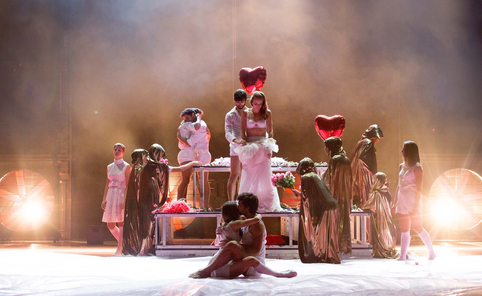 Die beiden isländischen Choreografinnen Erna Ómarsdóttir und Halla Ólafsdóttir formen aus dieser Musik und der literarischen Vorlage, aus ihrer persönlichen (Tanz)biografie und dem Hier und Jetzt ein eigenständiges Werk, jenseits von Klischees und Hierarchien, wie sie im klassischen Ballett üblich und historisch gewachsen sind. Die Bühne als offener Raum, der bis in den letzten Winkel ausgeleuchtet wird, ohne Bühnengassen und ohne Rückzugsmöglichkeit, zeigt sich ernüchternd und programmatisch zugleich. Da wirken das herabhängende, tränende Herz in grellem Neonlicht sowie die roten oder schwarzen Herz-Luftballons verloren und stimmig.