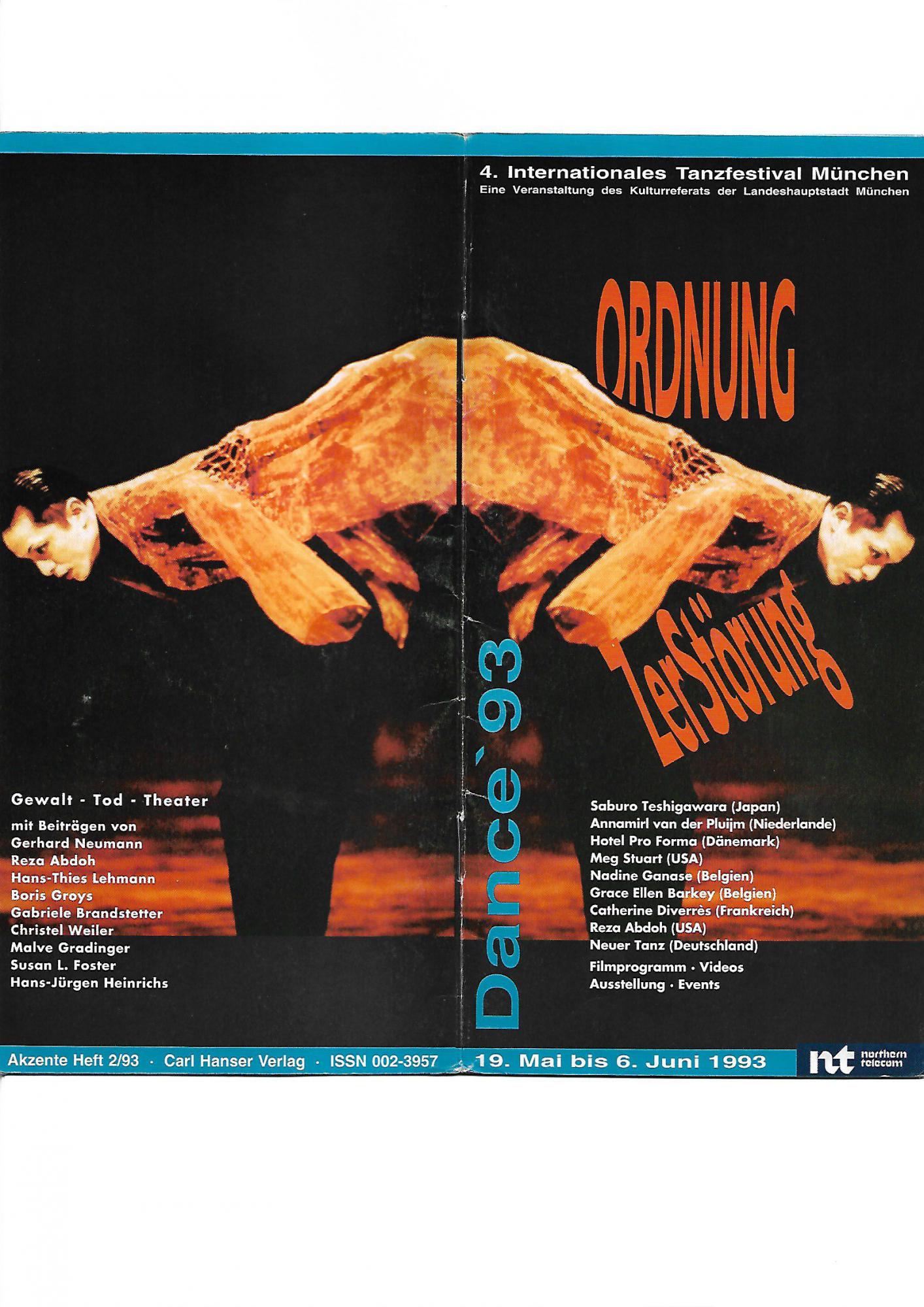 Das Motto des Festivals lautete „Ordnung und ZerStörung“. Unter diesem sehr weitgefassten Thema wurde „ein Querschnitt der jüngsten Entwicklungen im Medium Tanz, Tanztheater, Performance geboten – ein Medium, das wie kein zweites geeignet scheint, die gegenwärtigen kulturellen Erschütterungen zu reflektieren“, schreibt Siegfried Hummel, seit 1989 amtierender Kulturreferent der LH München im seinem Grußwort. Mit der provokativen Überschrift „Pornos in der Panzerhalle“ wurde in der „Abendzeitung“ (Roland Schmidt, 6./7.3.1993) das Festival-Programm angekündigt, womit bereits indirekt auf einen der Höhepunkte hingewiesen wurde. Der gebürtige Iraner Reza Abdoh (1963–1995), seit 1980 in den USA, war mit seiner in New York gegründeten Company Dar a Luz in der Panzerhalle auf dem Domagkgelände zu sehen. In seiner neuesten Arbeit „The Law of Remains“ porträtierte er den Serienmörder Jeffrey Dahmer in der Art eines zeitgenössischen Theaters der Grausamkeit, dessen Leben er mit der Pop-Ikone Andy Warhol verwob. Das Publikum erlebte die DarstellerInnen hinter einem Maschendrahtzaun in einem Szenario aus „Sex, Mordlust, Kannibalismus und ohrenbetäubendem Lärm“.
