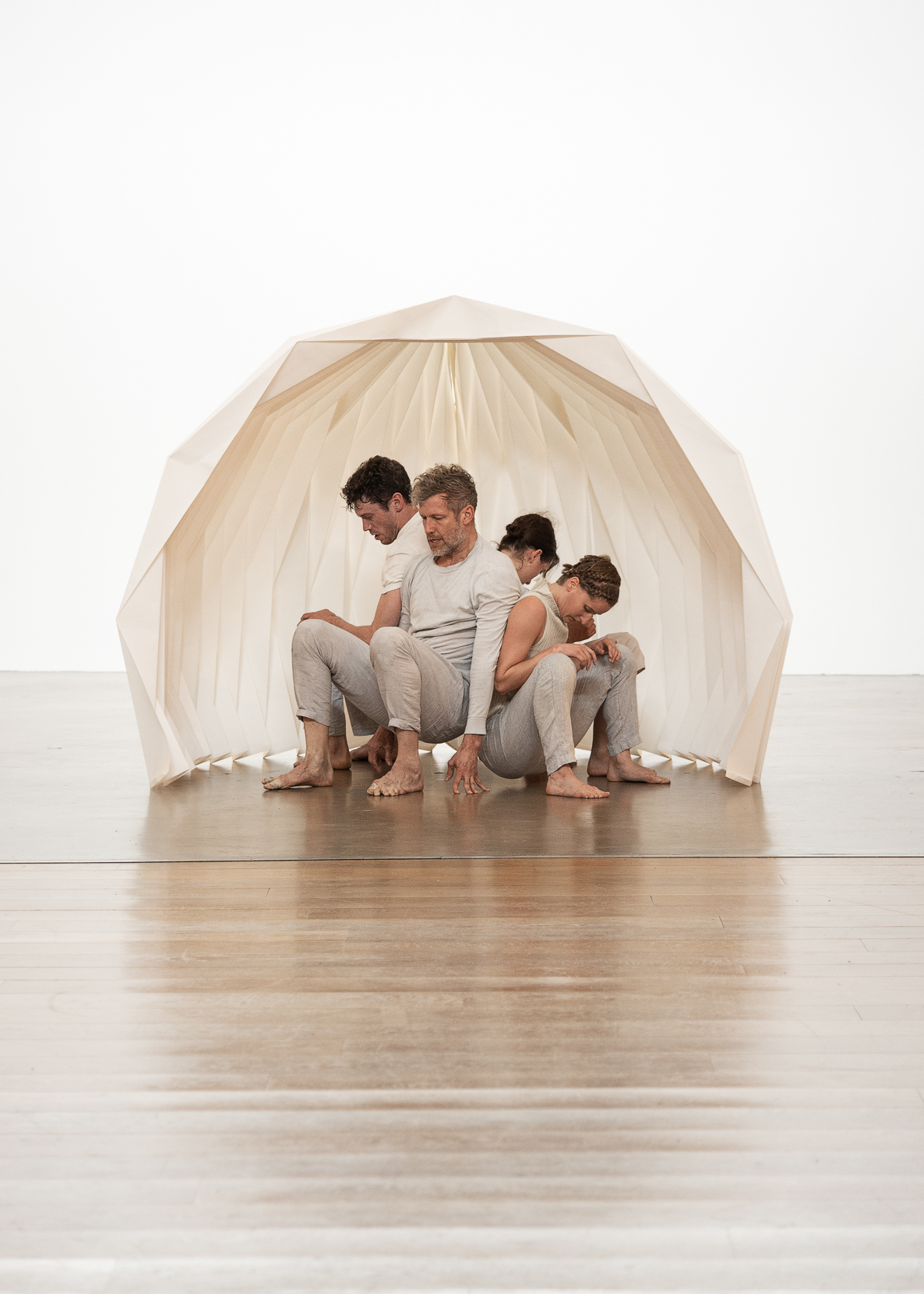 Drei TänzerInnen umgeben von mehreren Papierskulpturen waren zu Beginn auf der Bühne. Eine der Origami-Plastiken erwachte zum Leben, während die anderen drei sich in Super-Slow-Motion ihre eigenen Skulpturen erschufen. Ähnlich einer Ziehharmonika begann sich die Halbkugel zu regen, fächerte sich auf und zu. Wie eine Schnecke aus ihrem Haus oder eine Schildkröte aus ihrem Panzer, schälte sich dann erst eine Hand, bald darauf eine zweite, und schließlich der ganze Körper der letzten Tänzerin heraus. Zu viert begannen sie, sich mit den Origami-Skulpturen durch den Raum zu bewegen, sie zu entdecken: mal als Tablett, mal als Kleidungsstück, als Schutzschild oder Dach. Die spielerische und kreative Art im Umgang mit der Origami-Installation zog sich durch das gesamte Stück und kreierte immer wieder spannende Verfremdungseffekte, etwa als sich eine Tänzerin eine Lampenschirm-ähnliche Konstruktion aufsetzte und plötzlich in der Wahrnehmung der ZuschauerInnen zu einem kopflosen Wesen in Bewegung wurde.