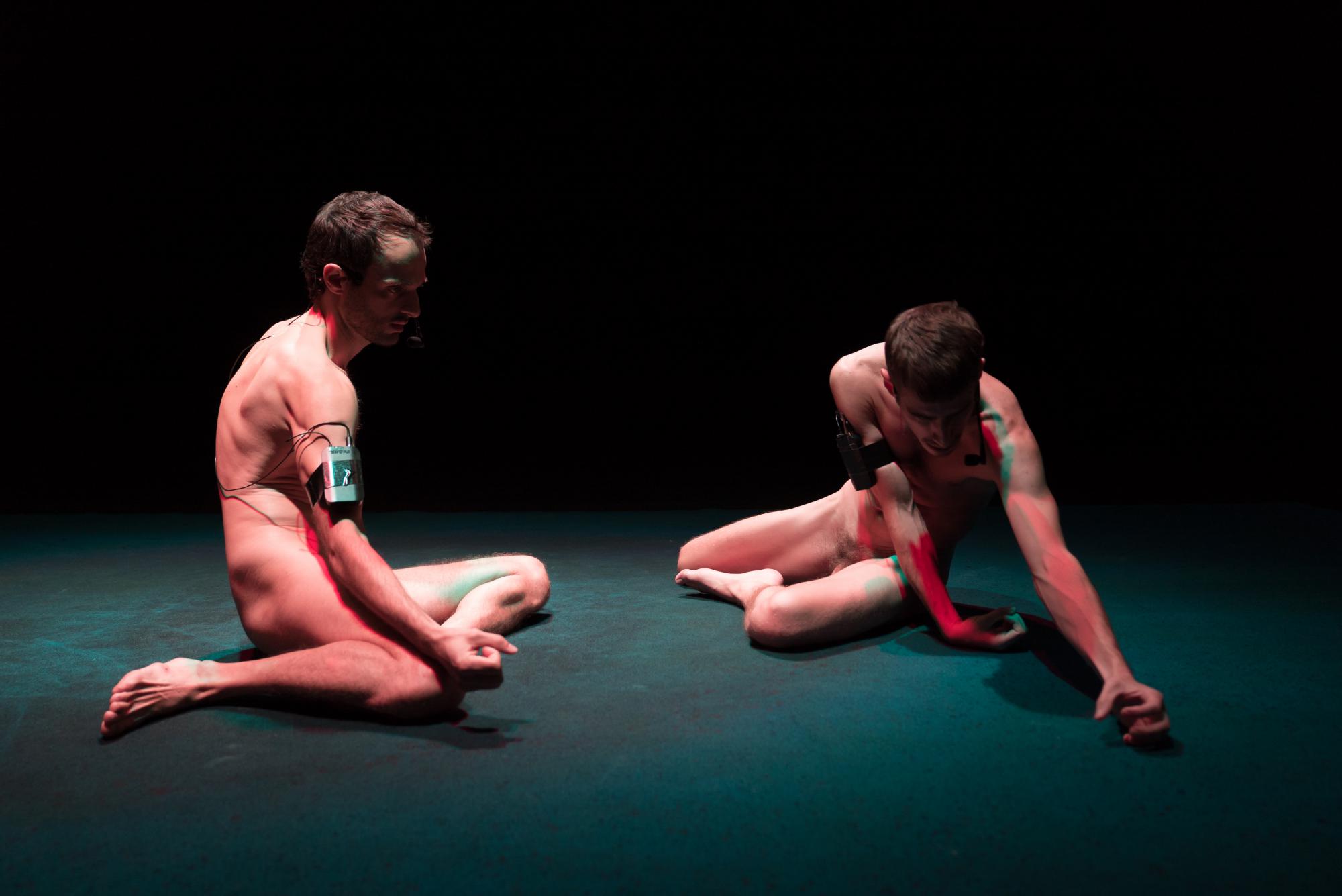 Zuletzt entfaltete der Schwede Jefta van Dinther in „Dark Field Analysis“ – einem ungewöhnlichen Text-Bewegungs-Duett zweier nackter Männer auf einem Teppichquadrat – einen Intensitätskatalog des Lebendigseins. Herausgefordert wurden dabei vor allem die Augen, denn nach und nach tauchten die beiden Performer Juan Pablo Cámara und Roger Sala Reyner in grün, später rot schimmernde Dunkelheit ab. Zwei menschliche Wesen, die im Prozess der Erinnerung an einen Sturz unter einer Soundwolke von David Kiers und PJ Harveys in die Mikroports geraunten Songs „The Slow Drug“ und „Horses in my Dreams“ zu einer amorphen, über den Boden wabernden Masse mutieren. Was als Frage-Antwort-Konstrukt in Slow Motion mit wiederholt roboterartigem Bewegungsfluss begann, kulminierte schließlich unter einem von der Decke hängenden Neonleuchten-Geviert in der schlichten akrobatischen Übung des Schulterstands. Gestützt vom Partner reckte der oben Stehende langsam einen Arm in die Höhe. Ein berührender Moment im intimen Total-Theater-Ambiente.