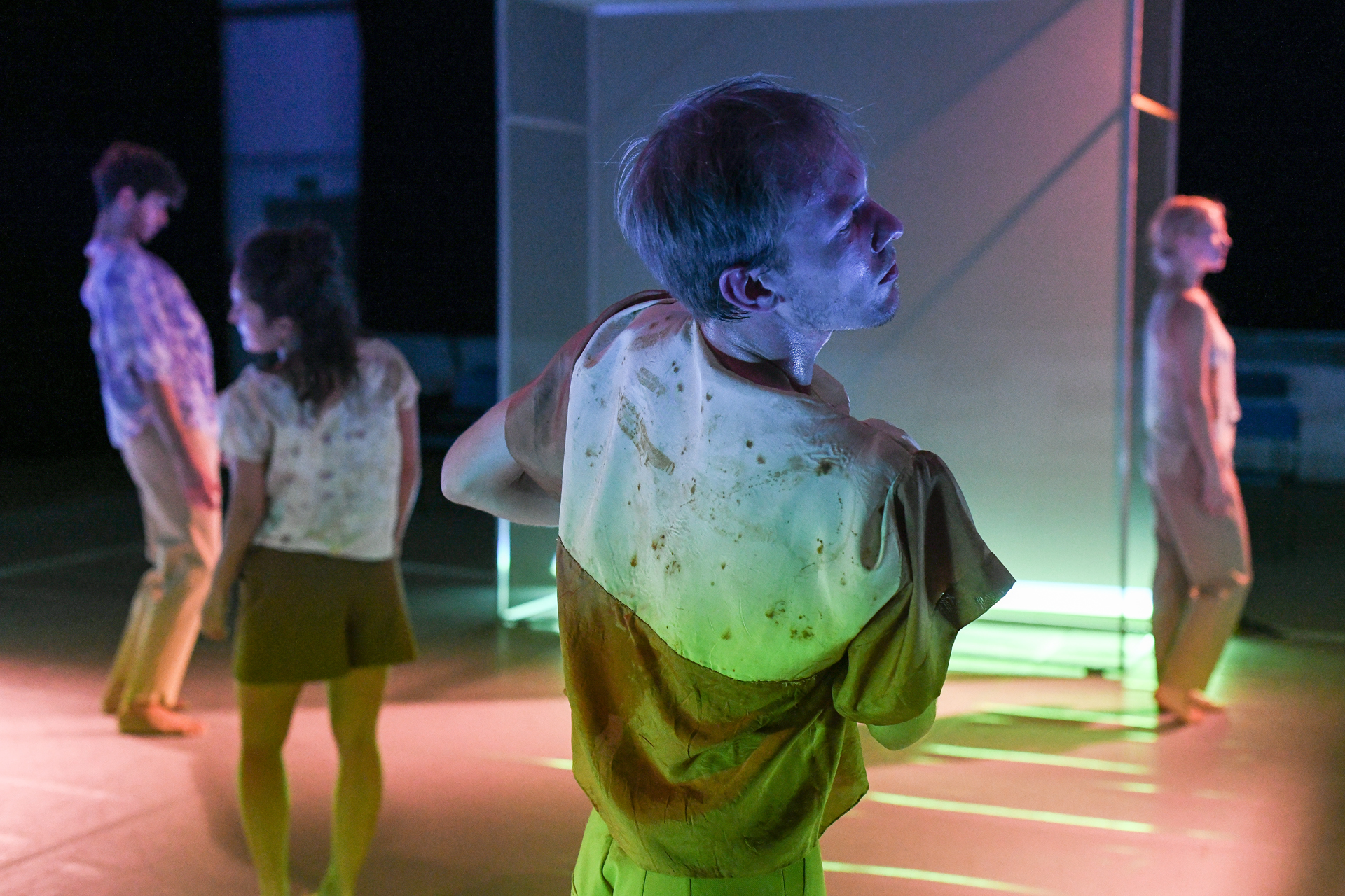 Schon das Setting macht Eindruck. Da kreuzen sich vier aus Leichtgestell konstruierte Gangelemente. Michele Lorenzini (Ausstattung), der sich über ein Austauschsemester an der Kunstakademie München zum Bühnen- und Kostümbildner mit Aufträgen an diversen staatlichen und städtischen Theatern mauserte, hat sie jeweils mit verschiedenfarbig durchscheinendem Stoff bespannen lassen. Rund um das Geviert aus zarten Mauern, dass nun – überaus coronatauglich, obwohl bereits vergangenen Herbst umgesetzt – das Zentrum der Bühne dominiert, nehmen die 43 Zuschauer*innen Platz. Ohne die sich momentan hochschraubenden Infektionszahlen dürfte man um die Tanzfläche herum flanieren.
