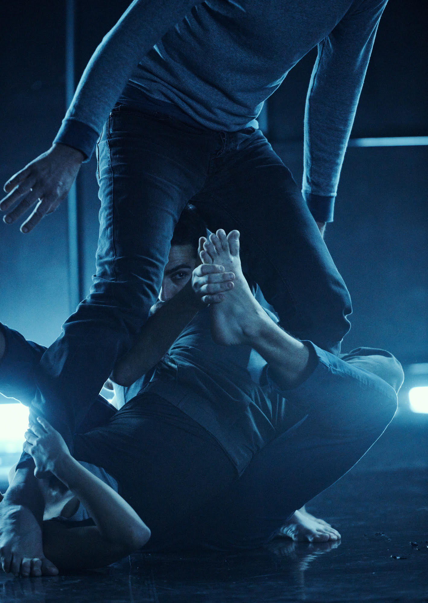 Starke Sache, wenn Tanz einer Räumlichkeit Sinn verleiht. Dieser muss dann gar nicht ausnahmslos hyperelaboriert oder bewegungsschmissig daherkommen. Gerade in Evandro Pedronis choreografischem Auftaktstück „Blue“ teilt sich eigentlich alles mit – durch die Positionierung im kärglich mit Neonleuchten aufgehellten Bühnenraum ebenso wie durch die körperliche Ausrichtung und Haltung plus intensive Blickwechsel der drei Protagonist*innen. Zäh, denkt man zu Anfang vielleicht. Und wird dann doch mit hinein in den mysteriösen Bann zwischen Örtlich- und Persönlichkeit gezogen.