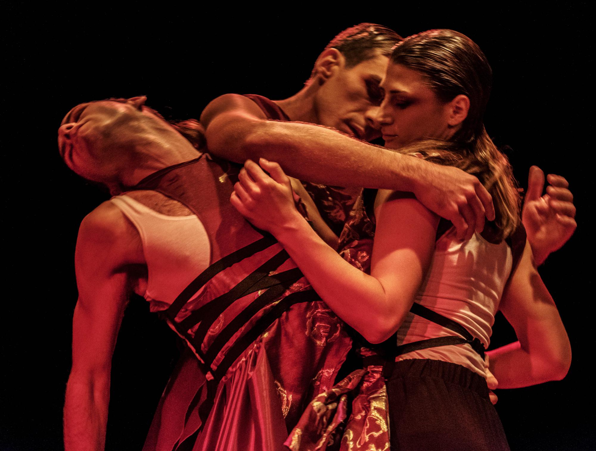 Indem der Beat immer stärker und eindringlicher wird, beginnt sich das Gewirr der drei Tanzkörper in Zeitlupe zu bewegen, weich, sinnlich, wie in Trance und im Rausch einer ausgelassenen Partynacht. Die Tänzer*innen Anima Henn, Alexandre May und Alessandro Sollima, allesamt gekleidet in weite schwarze Stoffhosen, weiße Unterhemden, anfangs darüber rote Oberteile mit orientalisch anmutenden Goldmusterungen, agieren als dreiteilige Körpereinheit. In weichen Bewegungen suchen sie die Nähe zueinander, berühren sich auf intime Weise, und es scheint, als erforschten sie die Körper der anderen und damit ihren eigenen, während mittlerweile bewegte Discolichter zur immer wiederkehrenden Liedzeile „You gotta feel it“ über die Bühnenwand tanzen. Während die Musik nach einigen Minuten ihren energetischen Höhepunkt erreicht, bleibt der Tanz beinahe schüchtern, zurückhaltend, bei sich und erzeugt eine anregende sinnliche Spannung.