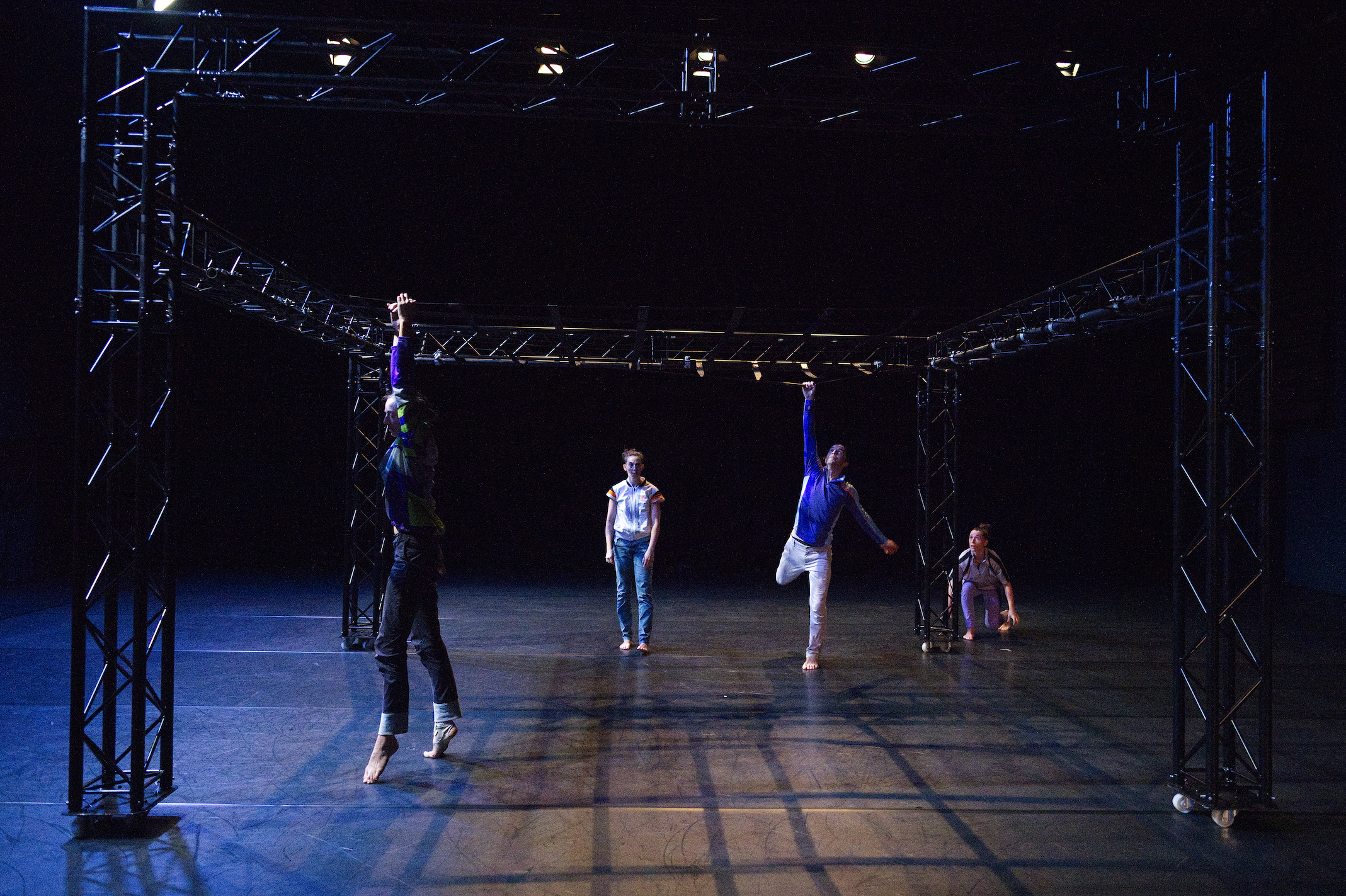 Erst als das Gerüst mit geballter gemeinsamer Kraft an die Bühnenrückwand gerollt und ‚endgültig‘ buchstäblich Platz geschaffen wird, ist Raum für Vielfalt und freies Atmen vollends möglich. Doch auch dieser Zustand ist nicht final, alsbald wird das Gerüst wieder zurückgeholt und wie auf ein lautloses Kommando klettern die vier Tänzer*innen in Sekundenschnelle zurück auf ‚ihr‘ Gerüst, ziehen sich auf ‚ihre‘ Burg zurück – hängen dort jedoch wie im Netz verfangene Insekten, wie Schiffbrüchige am rettenden Balken auf sinkendem Boot. Hängen dort lange, so lange, bis sie beginnen zu schnaufen, zu fluchen und zu schreien – „I quit“, stellt Sarah Huby fest, sie kann nicht mehr – die Schwerkraft zieht zu unnachgiebig an ihr, und ihr kopfüber hängender Partner droht mit dem Schädel voraus auf den Bühnenboden hart aufzuprallen. Zunehmende Unsicherheit ist beim Publikum spürbar: Ist dies das Ende der Vorstellung, soll man die Tänzer*innen mit Applaus erlösen? Doch es ist nicht der Abschluss, in einem rasanten Finale bleibt eine Tänzerin allein im Netz zurück und versucht kletternd zu entfliehen, droht sich jedoch immer mehr zu verheddern, während ihre Tänzer-Kolleg*innen sie unaufhaltsam und in schwindelerregendem Tempo im Gerüst drehen – ein so starker Eindruck, dass er sich physisch aufs Publikum überträgt. Plötzlich bricht der bedrohliche Strudel ab – die Tänzerin kann sich in letzter Sekunde befreien und ihre (Selbst-)Kontrolle zurückgewinnen. Sie hat wieder Boden unter den Füßen – eine momentane Ordnung wurde wieder innerhalb des Kollektivs hergestellt. Meterlange Plastikstriemen werden am Netz befestigt. An beiden Seiten gehen die Tänzer*innen mit diesen von der Bühne ab in den Zuschauerraum und spannen ein Netz über die Köpfe des Publikums. Dieses wird dadurch selbst zum Teil des Bühnenkollektivs, Teil der eingeschworenen Gemeinschaft. In die sich erneut ausbreitende Dunkelheit hinein wird das Bühnengerüst gemächlich, doch unaufhaltsam gen Zuschauerpodest gerollt und das Stück endet – wie auch sonst – in Bewegung, als visionäres Bild mit Blick in die Zukunft? Ein visionäres Bild mit Blick nach vorn. Ein Ende im Wandel – wir alle im Wandel und das ohne Unterlass, ohne einen Moment des Stillstands. Kein Sein ohne Wandel!
