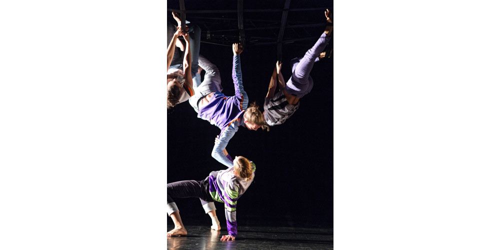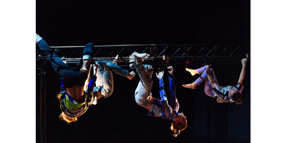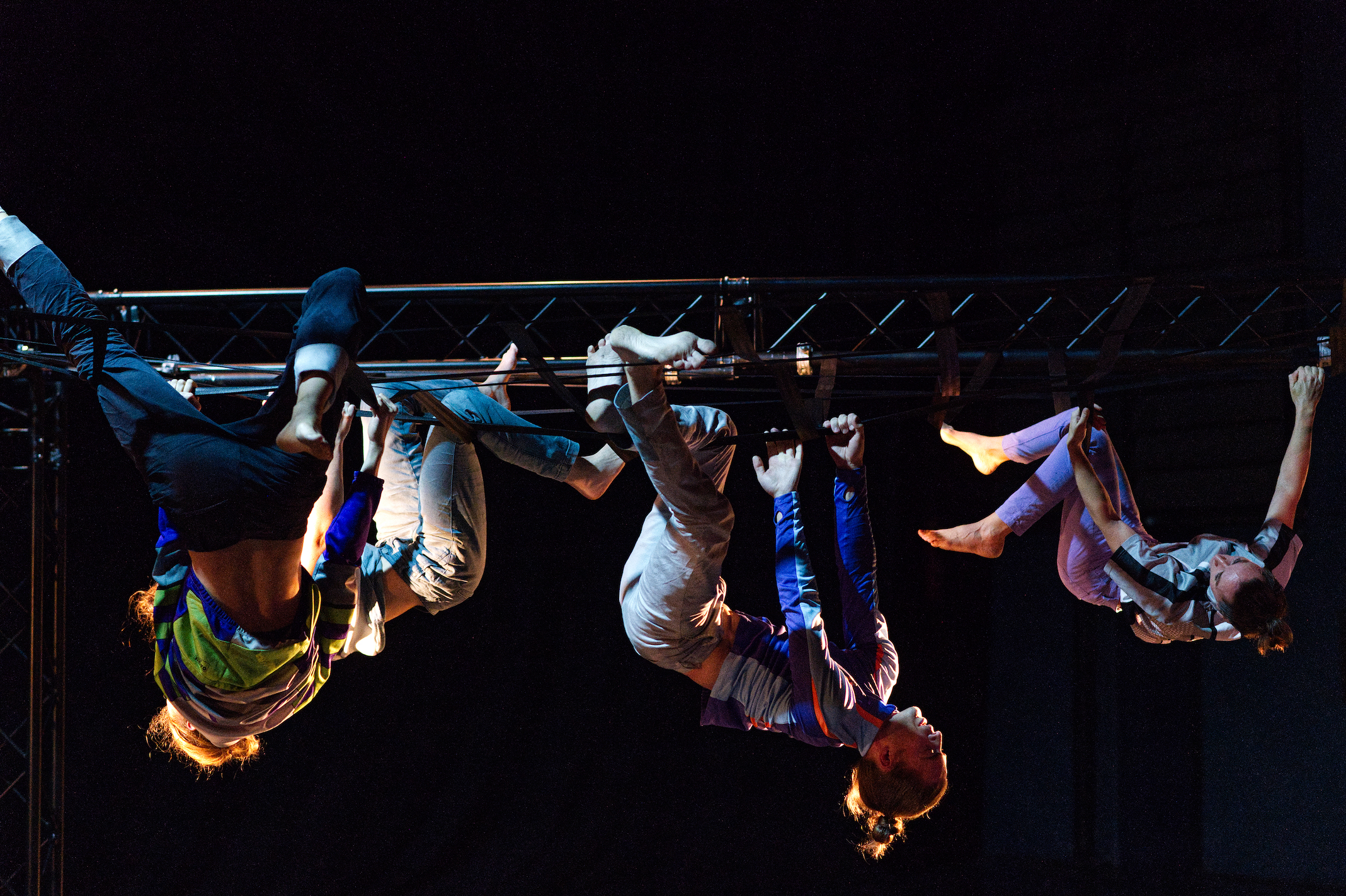Doch immer wieder ruft das Gerüst, als ‚sicherer Hafen‘ der Gewohnheit und des Altbekannten, die Tänzer*innen zurück und fängt sie wieder ein – einzeln, zu zweit, alle zusammen. Die Tänzer*innen antworten ihrerseits jedoch durch die neugewonnenen Erfahrungen mit nun waghalsigen leichtsinnigen Schwüngen – die in Überschlägen und gefährlichen Fällen zu münden drohen –, erobern mit ungeahnt geballter Energie ihr altes Terrain als neues für sich und beanspruchen es auf völlig andere Weise: Sie schwingen am Geländer entlang, klettern in Windeseile daran empor – mühelos, schwerelos –, balancieren freihändig auf den Netz-Striemen – das Leben als Balance-Akt per se. Furchtlos springen sie von großer Höhe und im Stand vom Trapez – gleichen Fallschirmspringern, ohne Fallschirm, absolute Kontrolle im bloßen Fall. Die Lust und Neugier aufs Leben überwiegen, Fehltritte als Folge werden in Kauf genommen: That‘s live! Virtuoses Klettern – virtuoses Scheitern! Was soll’s?!