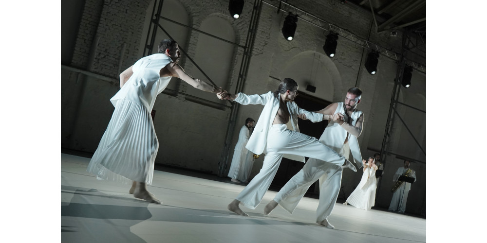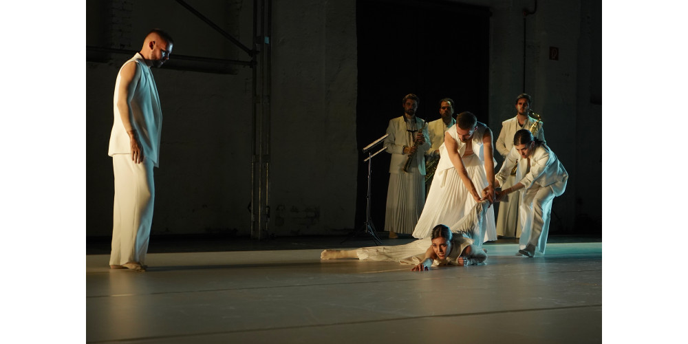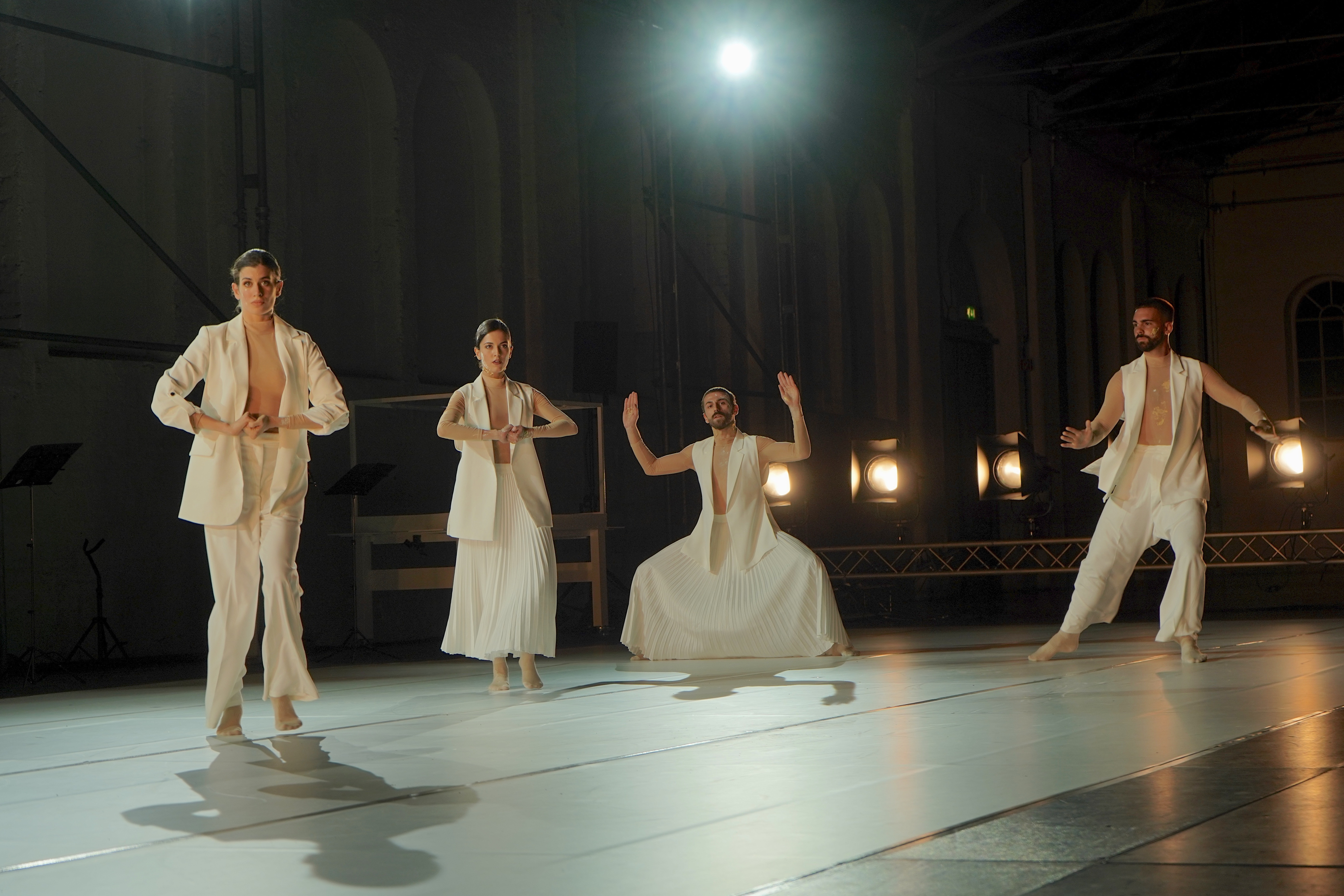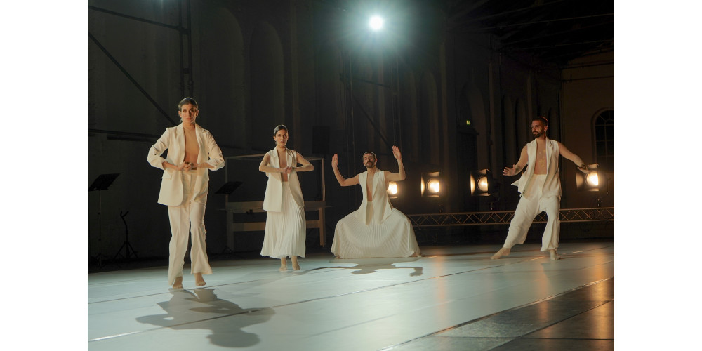 Ganz in Weiß und auf Strümpfen vor dunkler Kulisse tanzen die vier Tänzer*innen, oftmals akrobatisch, auf einer großen rechteckigen weißen Fläche Gefühle, sogar so etwas wie Walzerklänge sind zu hören, die das grelle, weiße Licht etwas milder erscheinen lassen. Bei der Darstellung von Gewaltszenen, teils in Zeitlupe, was eine besondere Körperbeherrschung abverlangt, verhärten sich nicht nur die Klänge, werden schrill und dissonant, bis hin zu Vierteltonreibungen, bevor sie in ruhige, harmonische Melodien im positiven Sinne dahinplätschern, wenn sich die Emotionen beruhigen. Präsentiert wird ein Spiel der Gegensätze, charakterisiert von Spannung und Entspannung, was sich durch die gesamte Vorstellung hindurchzieht. Dabei geht es nicht nur um den Kontrast Mensch und Künstliche Intelligenz. Thematisiert wird in dieser bemerkenswerten Kreation auch das menschliche Bewusstsein mit seinem Körperbewusstsein, das die Künstler*innen dem Publikum eindringlich vor Augen führen. Dass die künstliche Intelligenz nur Inspirationsquelle sein kann, wird an diesem Abend im perfekten Zusammenspiel aller Künste deutlich. Mit anhaltendem - echtem - Applaus werden die Akteure belohnt.