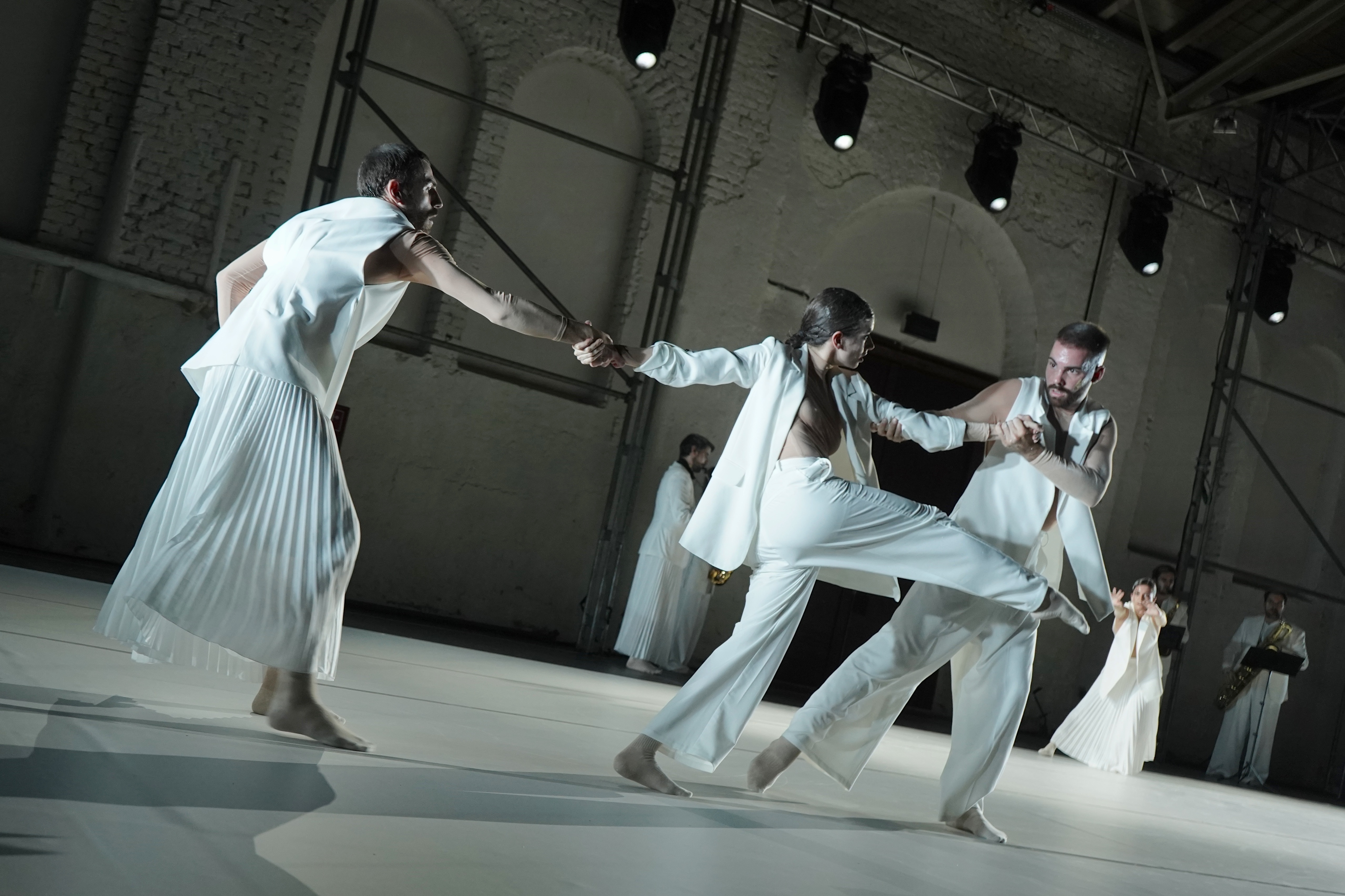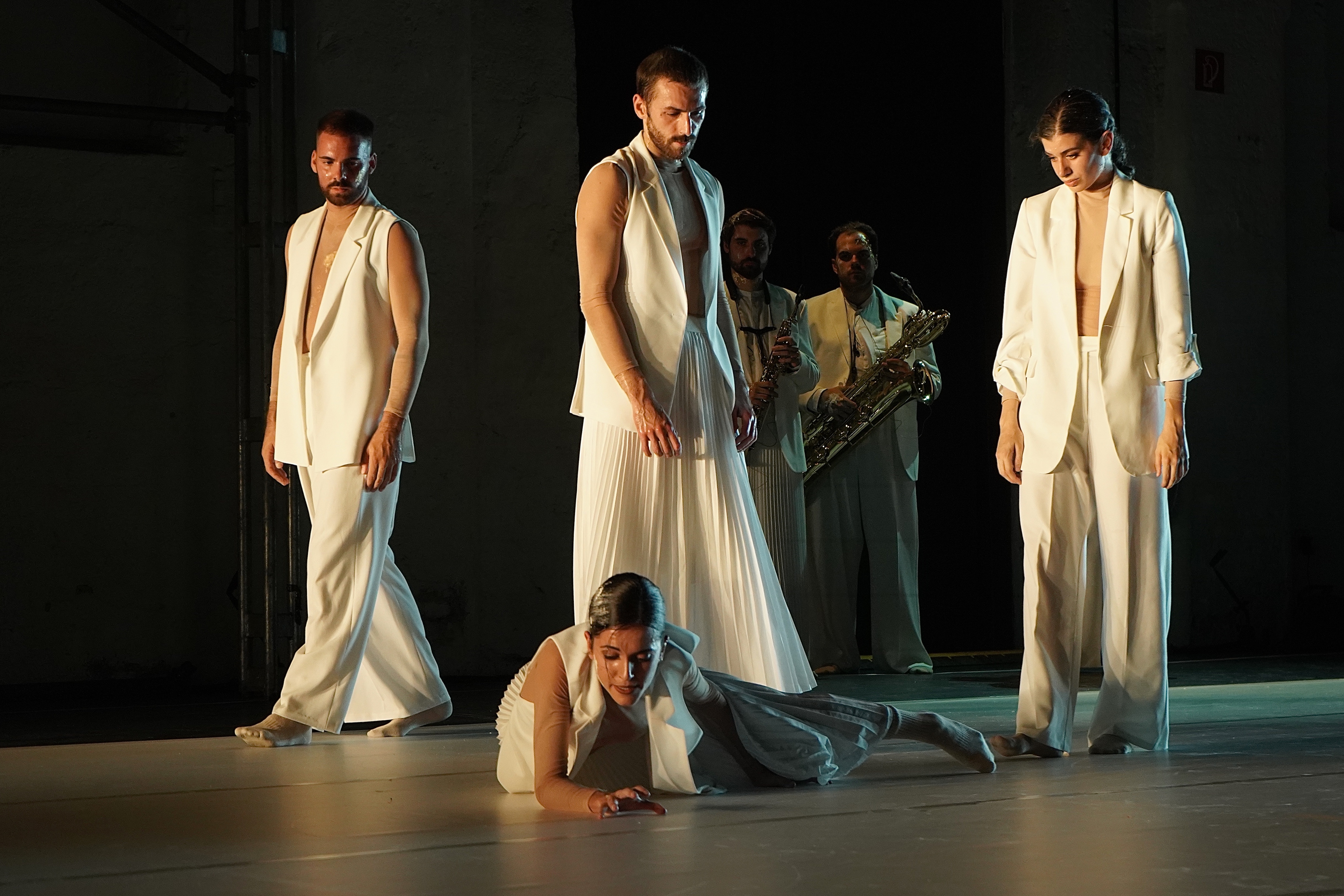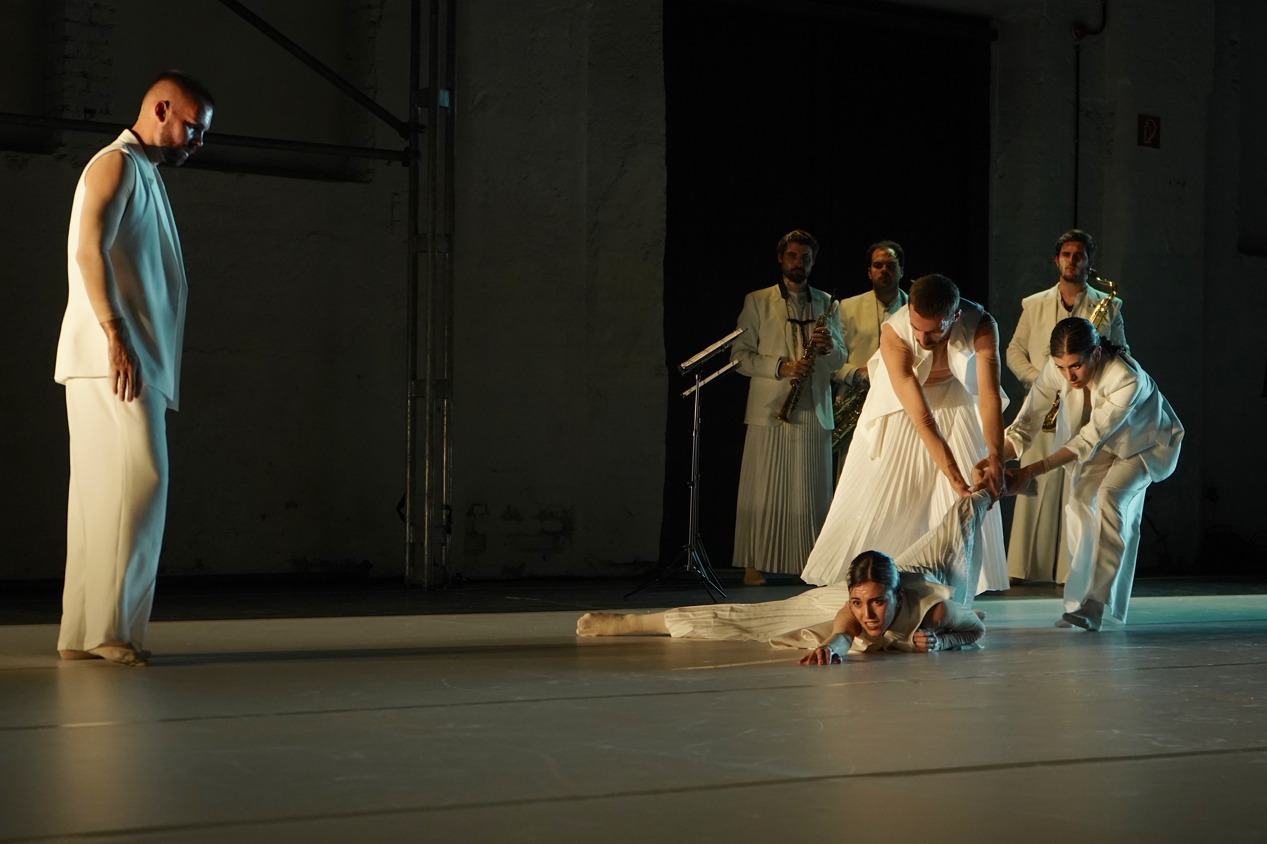 Ganz in Weiß und auf Strümpfen vor dunkler Kulisse tanzen die vier Tänzer*innen, oftmals akrobatisch, auf einer großen rechteckigen weißen Fläche Gefühle, sogar so etwas wie Walzerklänge sind zu hören, die das grelle, weiße Licht etwas milder erscheinen lassen. Bei der Darstellung von Gewaltszenen, teils in Zeitlupe, was eine besondere Körperbeherrschung abverlangt, verhärten sich nicht nur die Klänge, werden schrill und dissonant, bis hin zu Vierteltonreibungen, bevor sie in ruhige, harmonische Melodien im positiven Sinne dahinplätschern, wenn sich die Emotionen beruhigen. Präsentiert wird ein Spiel der Gegensätze, charakterisiert von Spannung und Entspannung, was sich durch die gesamte Vorstellung hindurchzieht. Dabei geht es nicht nur um den Kontrast Mensch und Künstliche Intelligenz. Thematisiert wird in dieser bemerkenswerten Kreation auch das menschliche Bewusstsein mit seinem Körperbewusstsein, das die Künstler*innen dem Publikum eindringlich vor Augen führen. Dass die künstliche Intelligenz nur Inspirationsquelle sein kann, wird an diesem Abend im perfekten Zusammenspiel aller Künste deutlich. Mit anhaltendem - echtem - Applaus werden die Akteure belohnt.
