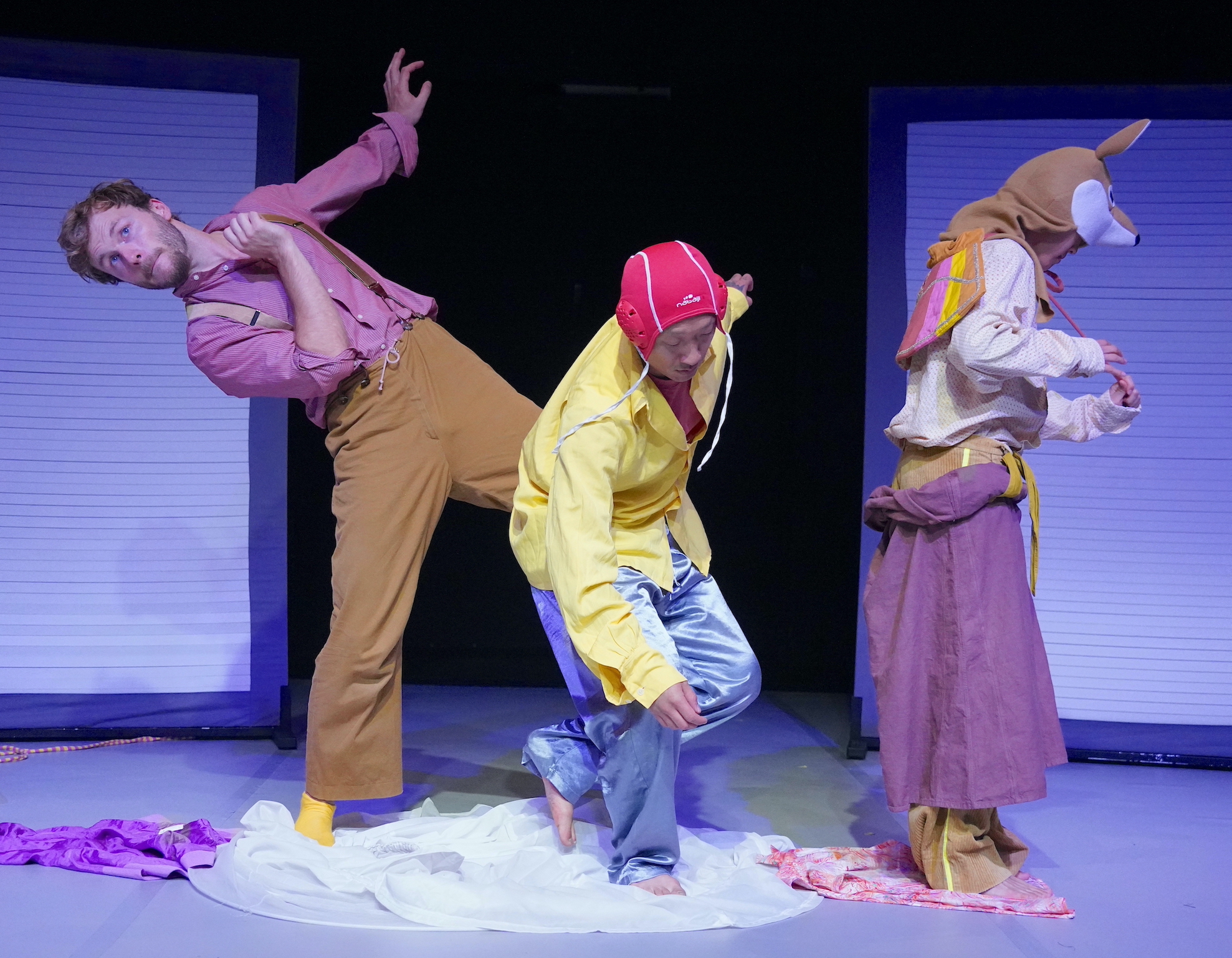 Zwei bewegliche Wände – Paravents – bilden die mobil-variable Rahmung des Bühnenstücks und werden multifunktional eingesetzt: als flimmernder überdimensionaler Bildschirm, Theaterkulisse, Ort des Rückzugs und der Verwandlung – zu mannshohen Wänden können sie werden, zur unbezwingbaren Burg, zum heimlichen Versteck, kurzum, zu all dem, was die Phantasie vor allem des Publikums hergibt. Nichts ist festgelegt, nichts ist bestimmt – unzählige Assoziationen und Bilder sind es, welche das Trio freimütig anbietet, aber es bleibt einem selbst überlassen, für welche man sich entscheidet. Freiheit und gedankliche Vielfalt, auch dies als eminenter Bestandteil dieser besten allen möglichen Welten.