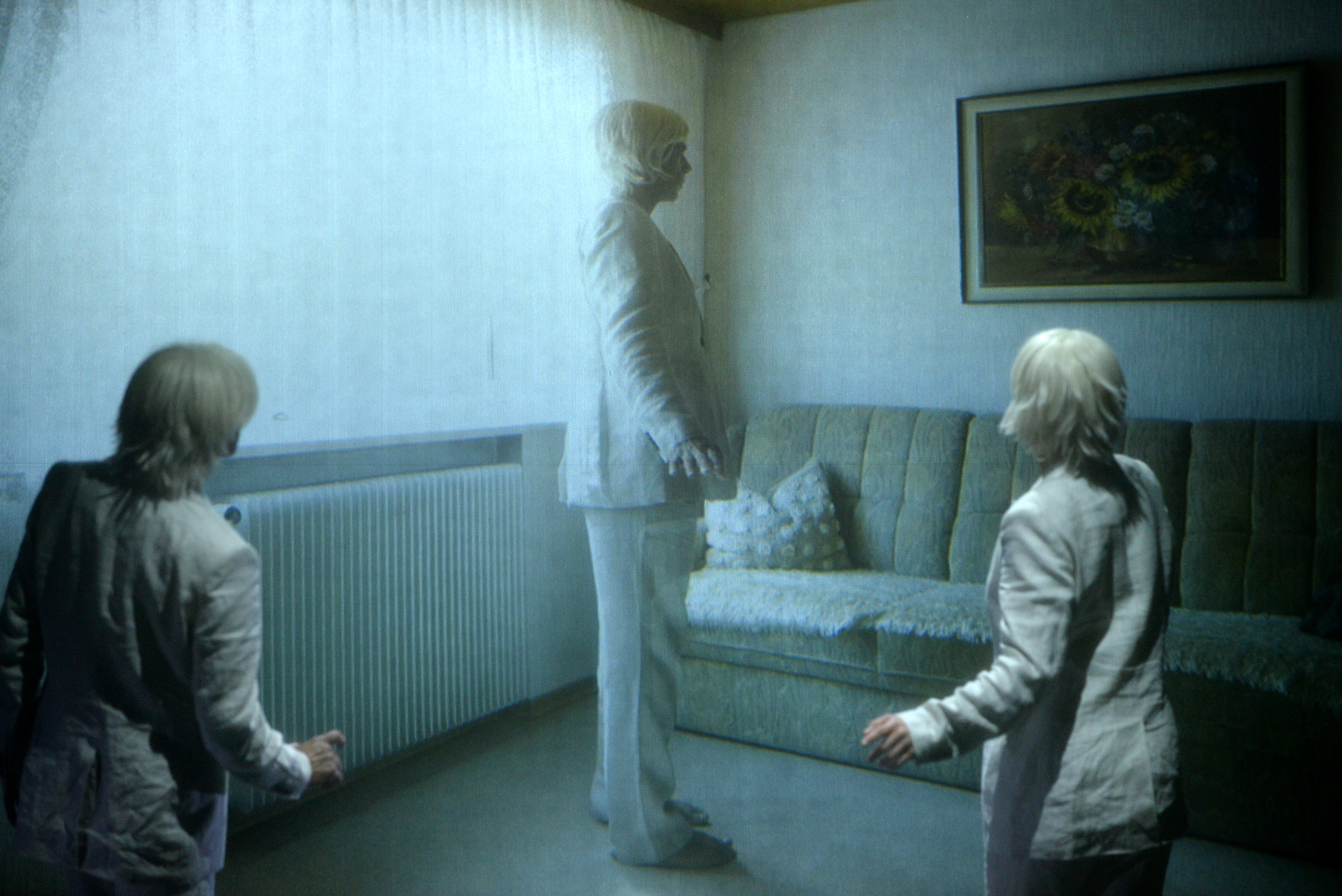 Das große Los im Vorfeld haben die Tänzerin Angela Mössner und ihr Kollege Nikos Konstantakis gezogen. Ihre Auftritte wurden vorab filmisch festgehalten. Und so turnen, chillen und wüten die beiden im Bühnenhintergrund des schwere reiter, ohne einen einzigen Tropfen Schweiß zu verlieren. Und noch etwas hat dieses kuriose – einerseits aus der Zeit gefallene, andererseits in ihren Räumlichkeiten gefangene – Paar Eléonore Bovet und Ludger Lamers, den zwei Live-Performern vor Ort, voraus: Sie können mir nichts dir nichts den hellen Anzug gegen ein rotes Kleid tauschen sowie mit sich selbst und dem Bild über der Couch verschmelzen. Auf das Motiv in diesem Gemälde kann man sich ebenso wenig verlassen. Es wechselt immer wieder seine Anmutung wie alles andere an diesem Abend. Das anfangs biedere Blumenstillleben verwandelt sich in ein Interieur, irgendwann kreisen dort Zeiger gegen den Uhrzeigersinn. Salvador Dalí hätte vermutlich seine Freude an Felbers surreal-düsterer Phantasie.