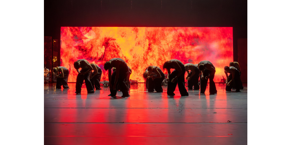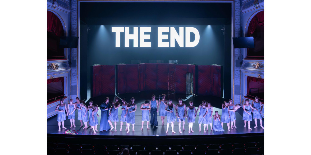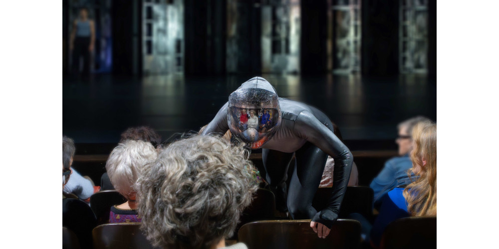 Die Omnipräsenz dieses ohrenbetäubenden Redens, Feststellens, Meinens, Findens und Forderns, dargestellt in großen verzerrten Lettern und Fotos, erzeugt ein den Herzschlag beschleunigendes, dumpfes Sägen, Hämmern und Rauschen. Und all das steht in reziproker Verbindung zu jenem Tempo und Timbre, das man seit dem vergangenen Wochenende in Goyo Monteros neuestem Wurf am Staatstheater Nürnberg erleben kann. Das Stück mit dem Titel „Steppenwolf“ nach dem gleichnamigen Roman von Herman Hesse aus dem Jahr 1927 funktioniert wie ein schnell geschnittener Videoclip, mit Anleihen bei Peeping Tom oder gar Arthur Schnitzlers „Traumnovelle“, verfilmt von Stanley Kubrick unter dem Titel „Eyes Wide Shut“. Hier übernehmen die scharf aneinander und wie im Traum aufpoppenden Bilder, erzeugt durch Tanz, Schauspiel, Sprache, Masken und Gesang oder durch riesige Projektionen von großer oder kleiner Laufschrift, in denen die Worte „kill“, „war“, „the end“ blinken, oder gar Traumbilder, das Ruder. Die Narration geht unter: Nur noch einzelne „erzählende“ Teile schwimmen am Ende wie Inseln in einem aufgepeitschten Ozean im Geist der Betrachtenden.