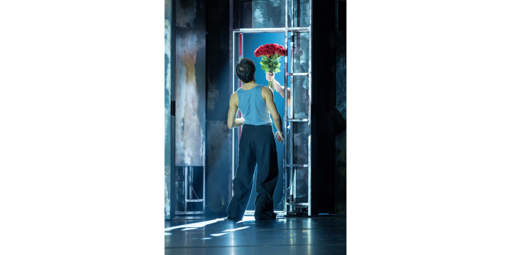 In Nürnberg lässt Montero zu Beginn seines Stücks, dem das Programmheft als Gliederung die magische Zahl von zwölf mit kurzen Titeln benannten Türen als Objekte des Öffnens und des Schließens, des Übertritts und des Durchschreitens zuschreibt, das ganze Ensemble einheitlich in grauen Anzughosen und Rippenstrick-Unterhemden die Bühne betreten, hinter ihm ein Aufbau schräg gestellter, schwerer Türen aus rostigem Eisen und Metall. Im Chor intonieren sie auf Englisch Sätze aus dem Harry Haller-Roman, in dem Hesse die innere Zerrissenheit der Hauptfigur zwischen einem Leben als angepasstem Bildungsbürger und Kulturkritiker, zwischen Angekommenem in der Gesellschaft und einsamem Außenseiter ohne Bindungen oder Beziehungen verhandelt.