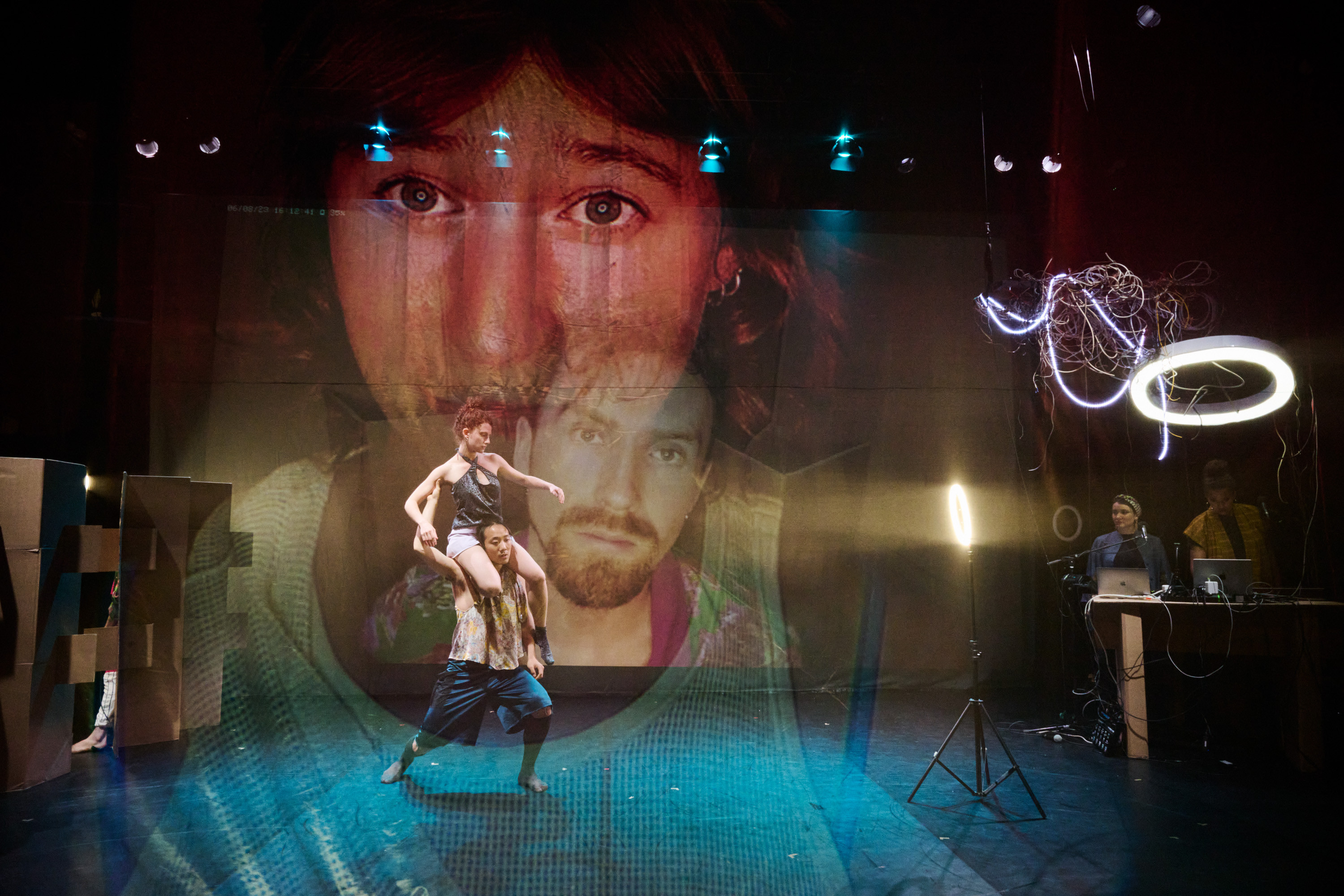 Ist das, was ich sehe, Realität – und wenn ja, wie viele? Diese Frage möchte man sich gleich zu Anfang stellen: zu Elektromusik kreist eine Tänzerin – oder ist es eine Influencerin, die content kreiert? - mit einer Kamera, vor die eine Ringleuchte montiert ist, um eine Konstruktion aus faltbaren Stellwänden. In den Falten stehen, für das Publikum nicht sichtbar, die übrigen Tänzer*innen, ihre Bilder werden über die Kamera auf die Rückwand der Bühne übertragen. An Hans van Manens LIVE erinnernd, stellt sich die Frage, wer real(er) ist: der lebende, atmende Tänzer, den das Publikum nicht sehen kann, oder seine zweidimensionale Projektion.