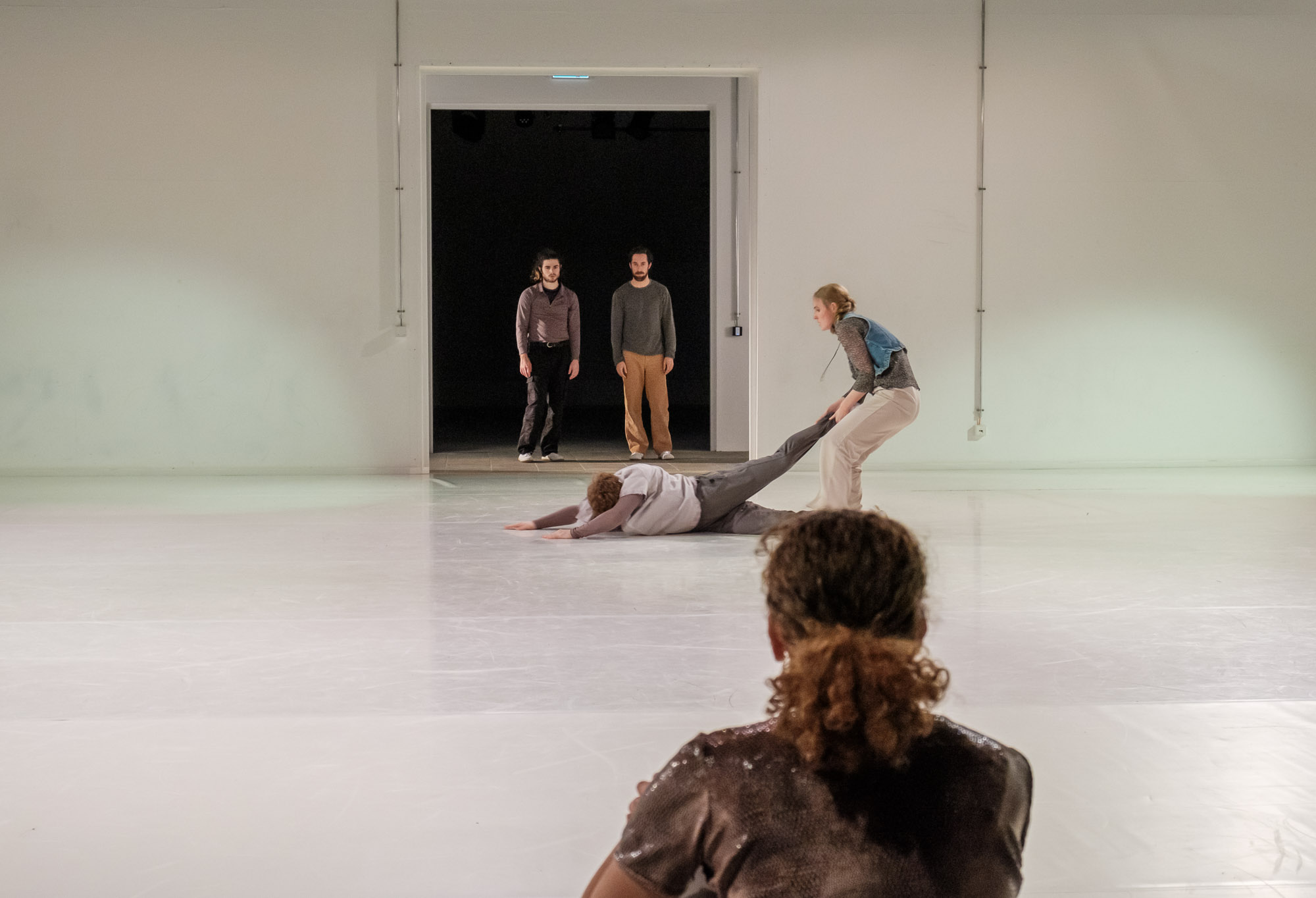 Allerdings zieht es sich schon hin, das Kommen und Gehen, die Befindlichkeiten im Dazwischen von Aktivität und Passivität sowie die geschmeidige Launenhaftigkeit sich im Raum dahintreiben lassender Körper. Kaum kommt das Stück in Fahrt, wird dessen quasi spontaner Fluss schon wieder unterbrochen – durch sich wiederholend relaxte Posen. In Aufbruchsstimmung formieren sich Paare zu einer munteren Polka. Man kreuzt sich einmal im Raum und quert die Bühne noch ein zweites Mal. Danach ist die halbe Gruppe auf und davon.