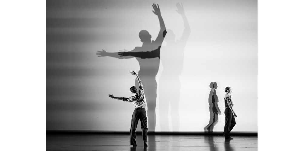 Die Tänzerinnen mit strengem Dutt und Gretchen-Flechtfrisuren versehen, und die Tänzer*innen allesamt in grobe Hosen und Hemden gesteckt, haben viel von einer (Nach-)kriegs-Ästhetik, wirken wie Heimkehrer, die von der traumatischen Vergangenheit auch in der Gegenwart heimgeholt werden: fragil-elegante Wesen aus einer anderen Zeit, auf deren zarten Schultern schwere Last liegt. Eine Tänzerin erblickt den überlebensgroßen Schatten ihres womöglich verschollenen Geliebten, verzweifelt pocht sie gegen die Rückwand der Bühne. Zur schmelzenden Stimme eines Countertenors in John Taveners Liedkomposition „The Hidden Face“ entspinnen sich schwelgend-schöne Duette: Körper werden in virtuosem Schattenspiel vervielfältigt, verkleinert und vergrößert. Erst nach einer Weile begreift der Zuschauer, dass es sich bei manch vermeintlichem Schatten gar nicht um einen solchen handelt, etwa wenn sich dieser entkleidet und als nackte Hülle von einer im Bühnenvorderraum befindlichen Tänzerin (Madeleine Dowdney) verfolgt wird – Das verborgene Gesicht. Viele Geschichten werden simultan erzählt: Ein Paar (Bianca Teixera und Matteo Dilaghi) küsst sich innig, während Severin Brunhuber in einem unsichtbaren Schützengraben erschossen wird oder Ibraimova mit unendlich biegsamem Oberkörper Cambrés vollführt, sich selbst gleichsam zusammenfaltet – sie bleibt für sich allein, bis zum Schluss. Intensive Bodenarbeit zeichnet die Choreografie aus, die sich insgesamt haarscharf an der Grenze zum zu viel des Pathos bewegt. Ein Stück von fast zu einseitiger Schönheit und Schmelz im recht konventionellen Bewegungsvokabular; die durchweg großartigen Tänzer*innen werden für ihre Leistung jedoch am Ende des Stücks zu Recht mit starkem Beifall belohnt. Ein Tanz der Erinnerung, des Gestern und der Vergangenheit, dem ein wenig mehr Gegenwart jedoch nicht geschadet hätte.